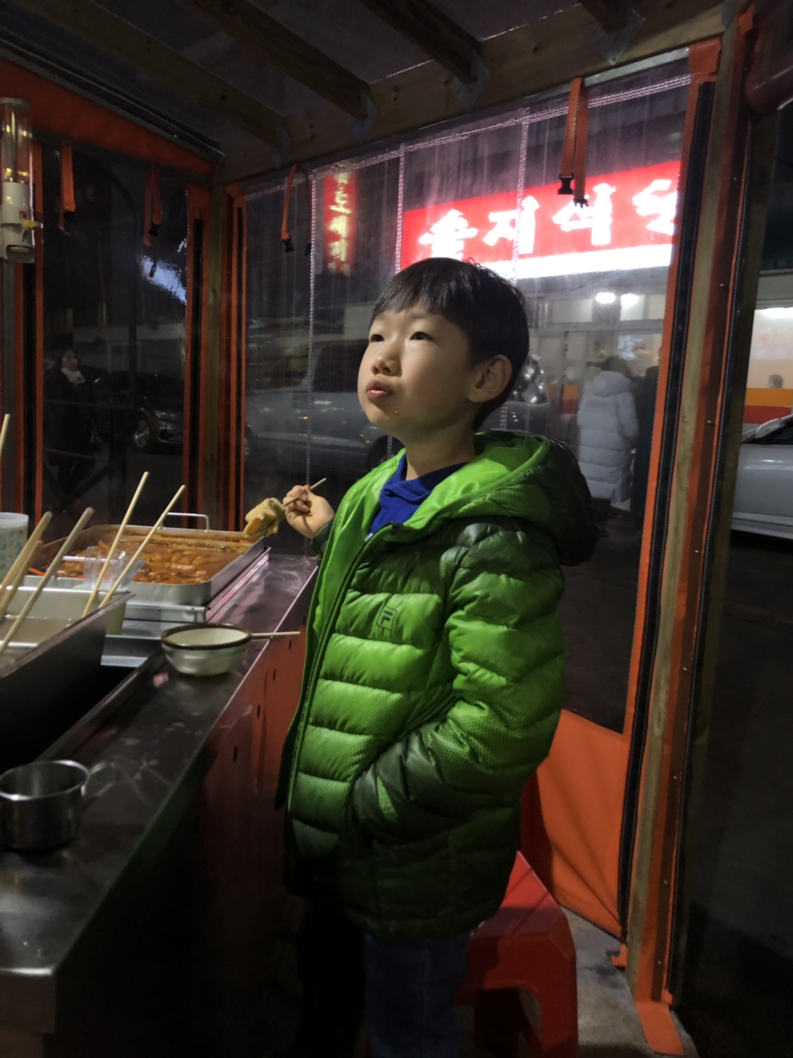 줄서서 먹는 고기집 배경으로 어묵 먹기.