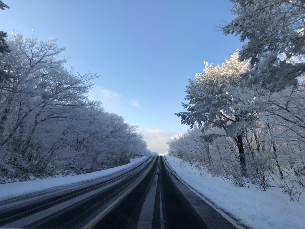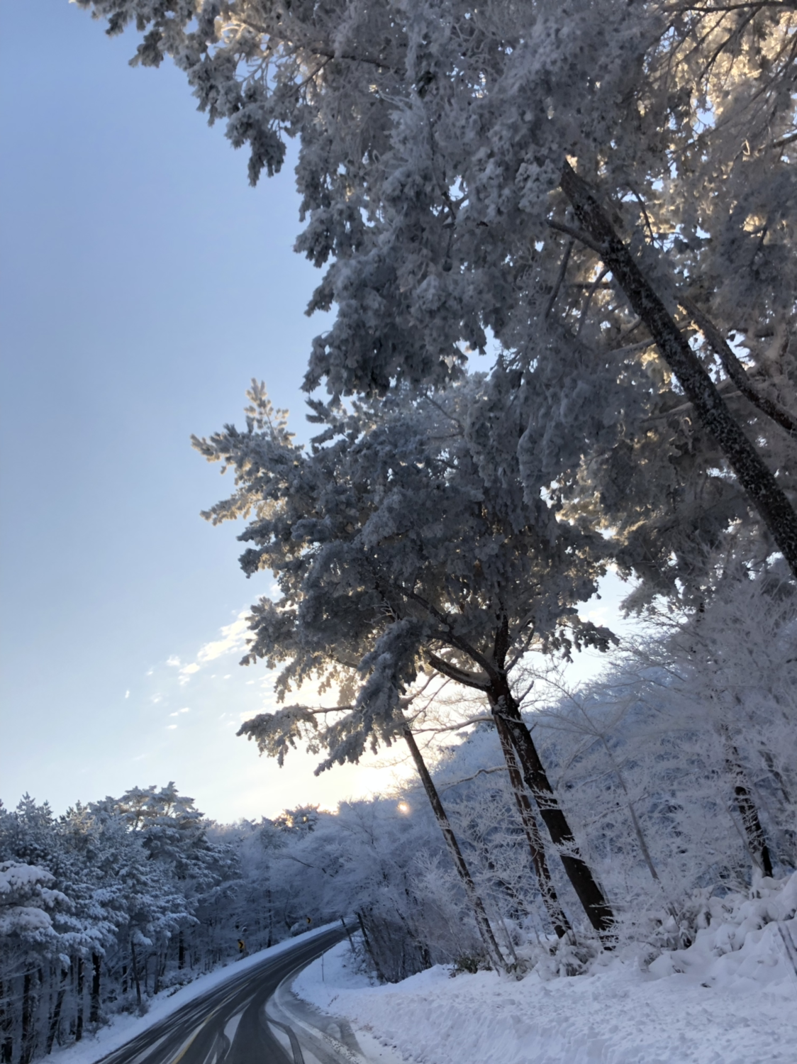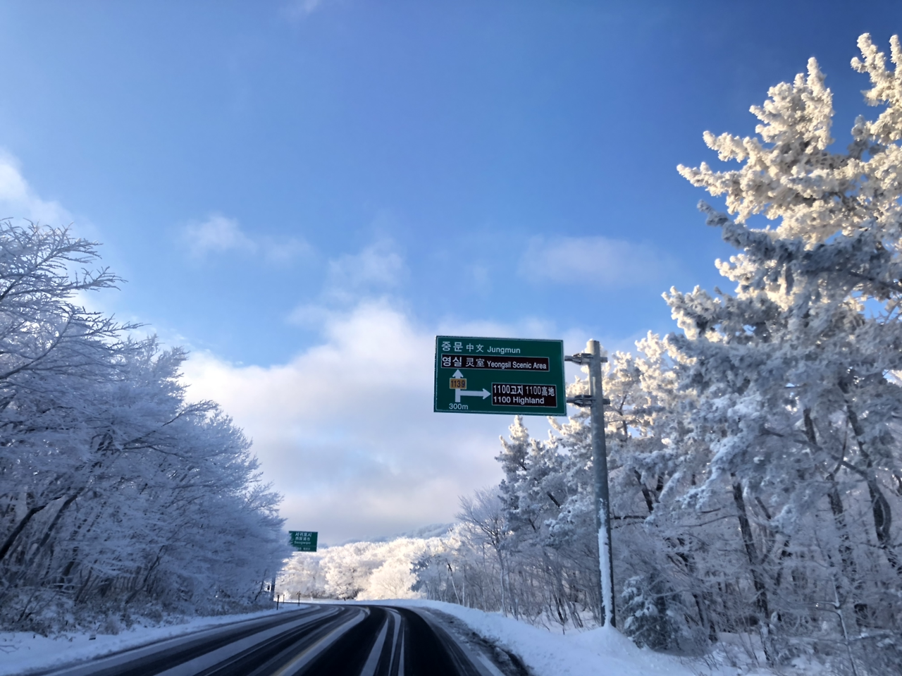 눈 길이라 체인을 장착하지 않은 차들은 2.5km 밖 제설 작업이 잘 되어있는 아래 주차장에 주차를 해야한다.