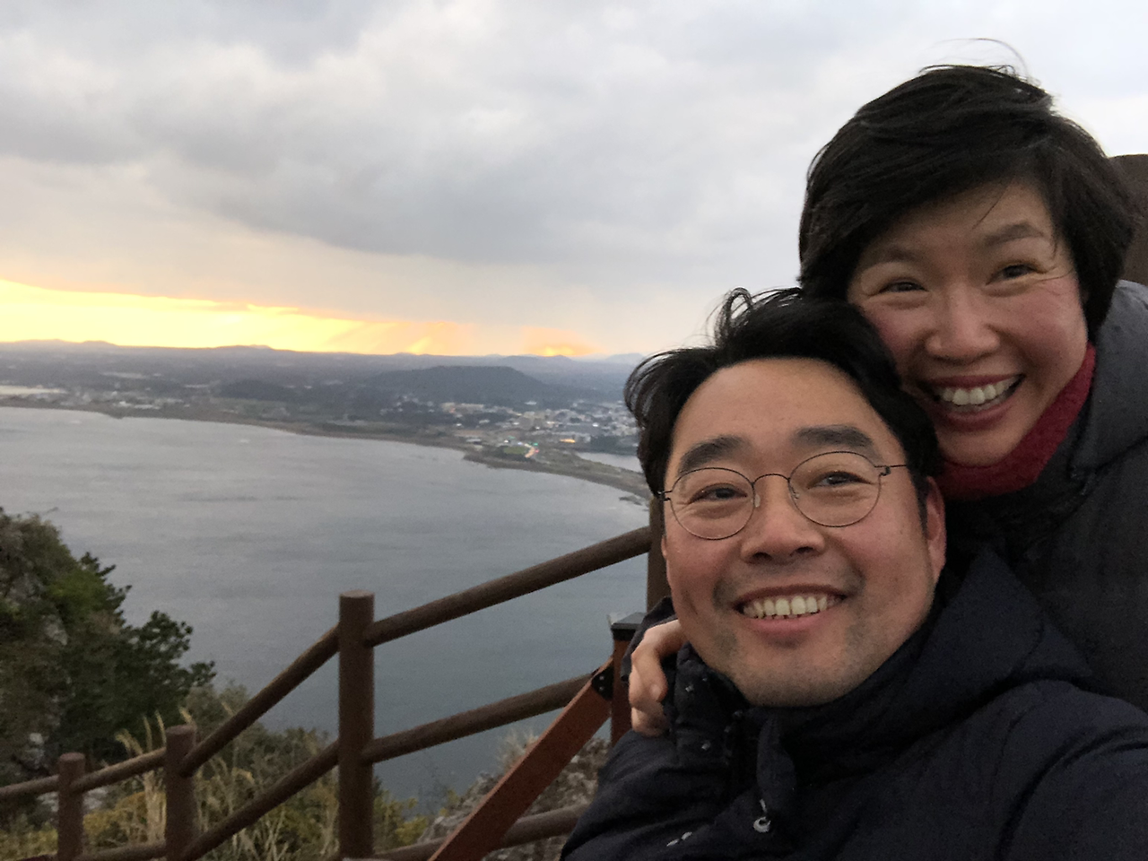 일출봉에 오르기 싫다는 아이들은 차에서 간식 먹으며 게임을 하고 우리 부부는 일몰을 기대하며