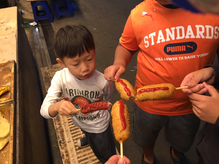 따끈한 핫도그 하나씩 입에 물고 시장 구경.