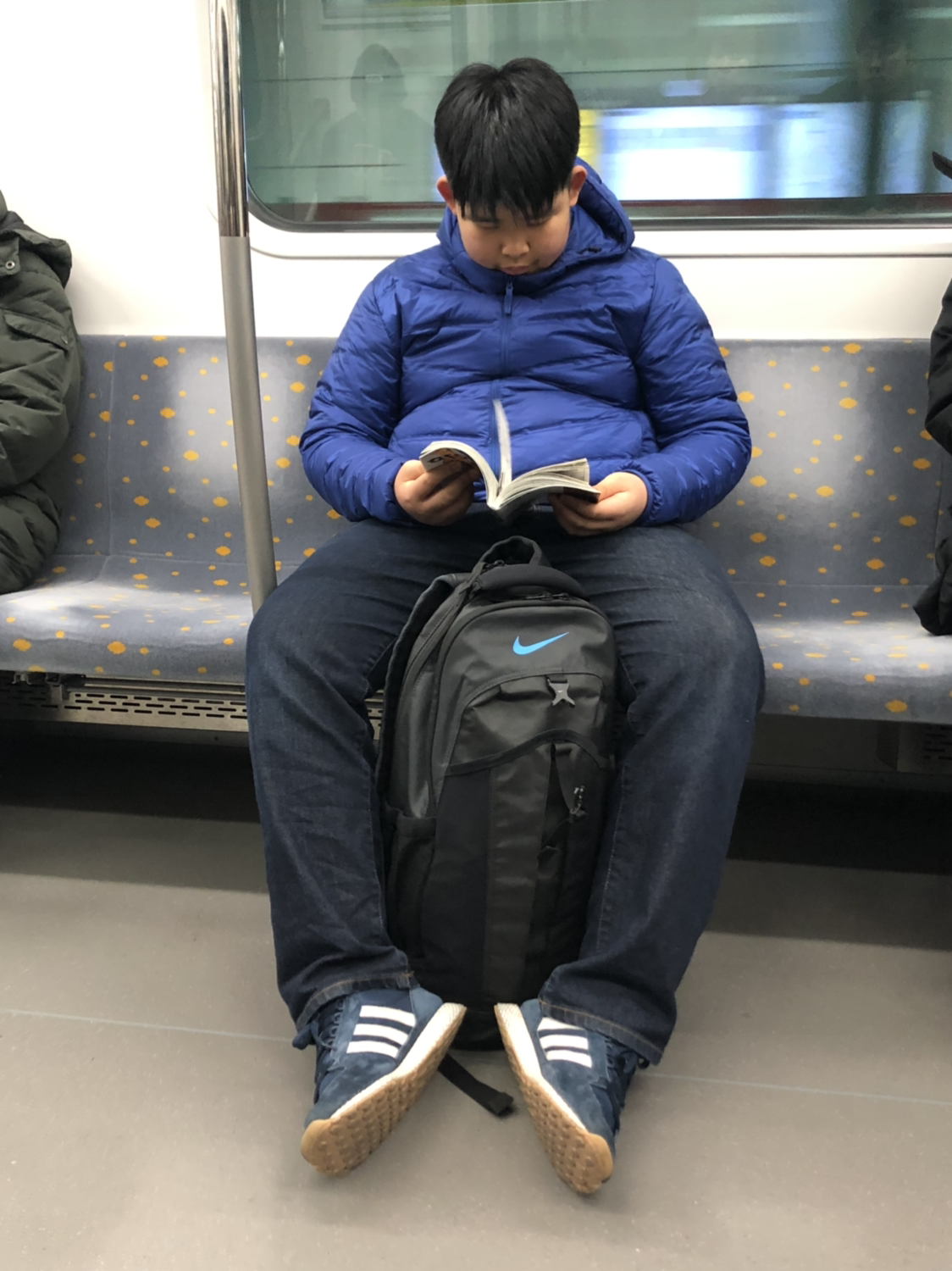 지하철 안에서 친구와 통화하는 둘째.