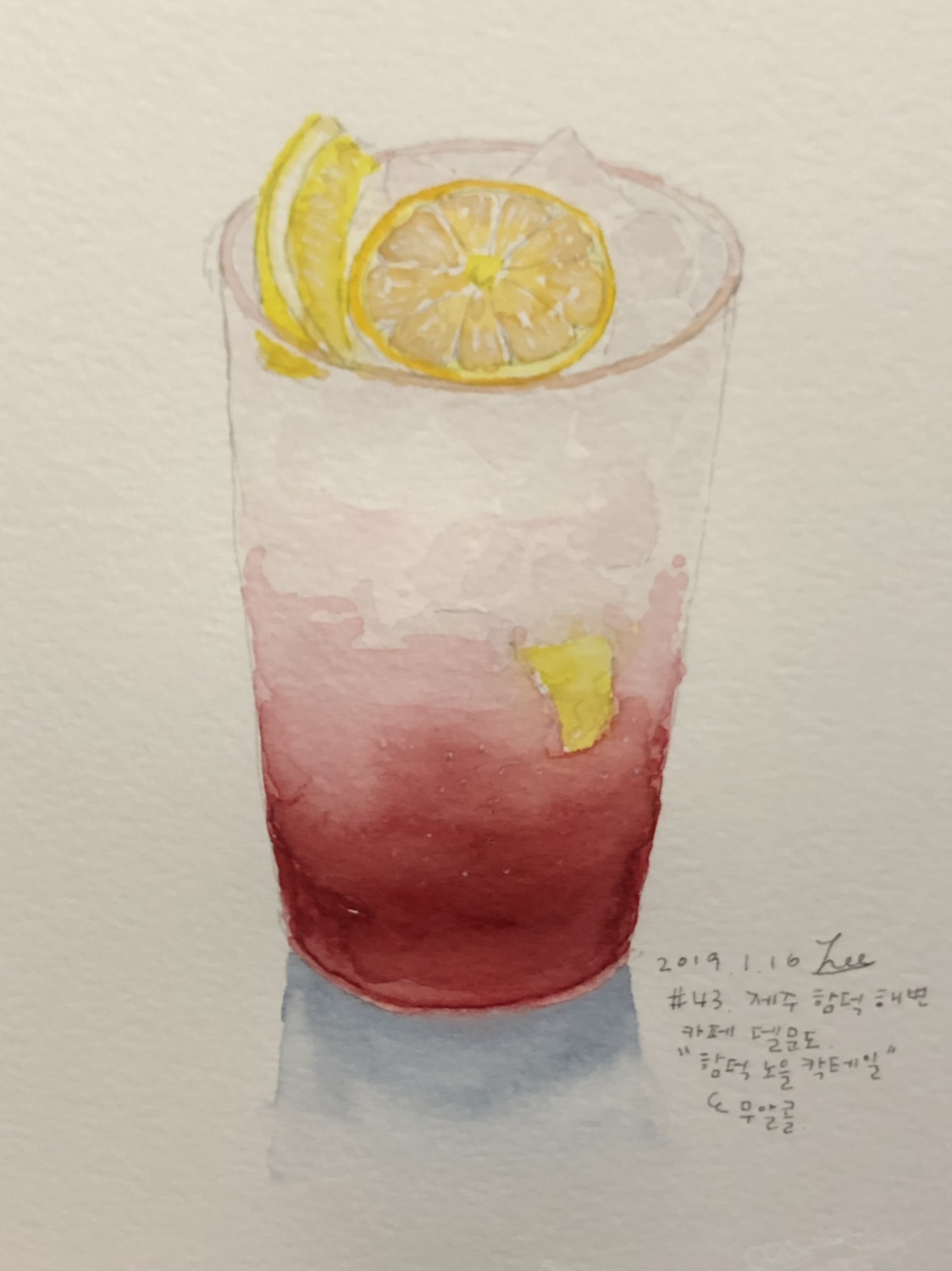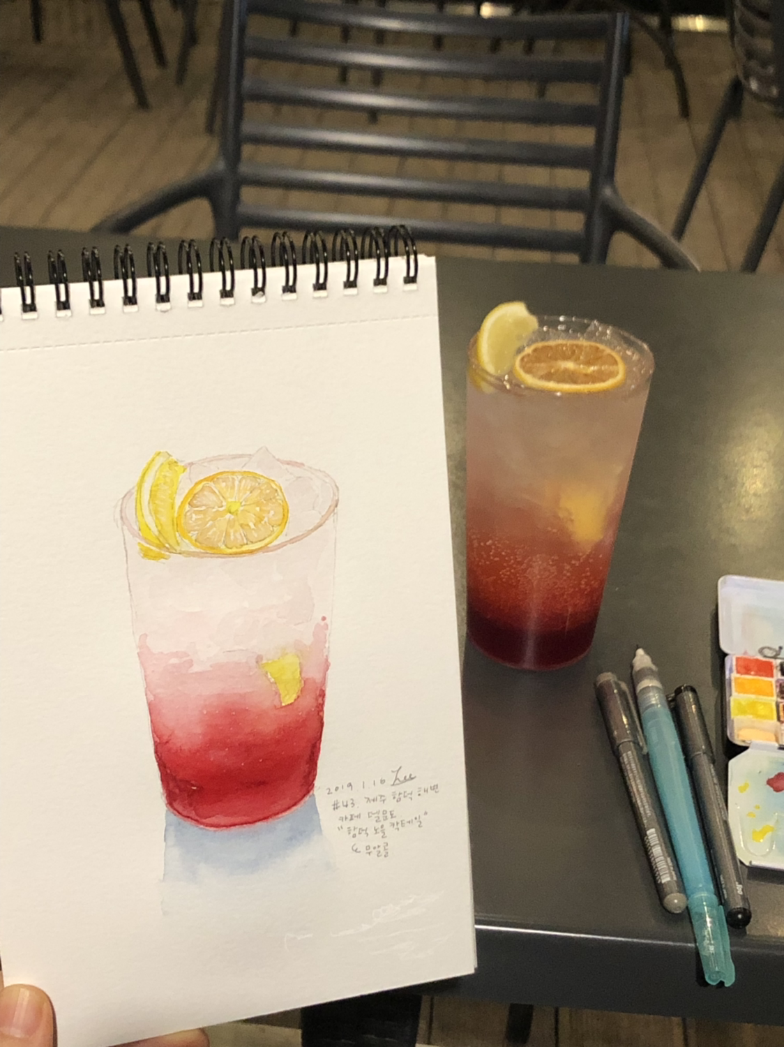 근데 플라스틱 잔에 주네. 좀 근사한 잔에 담아주지. 그리기는 편해서 30분 만에 싱겁게 끝난 마흔 세번째 어반스케치.