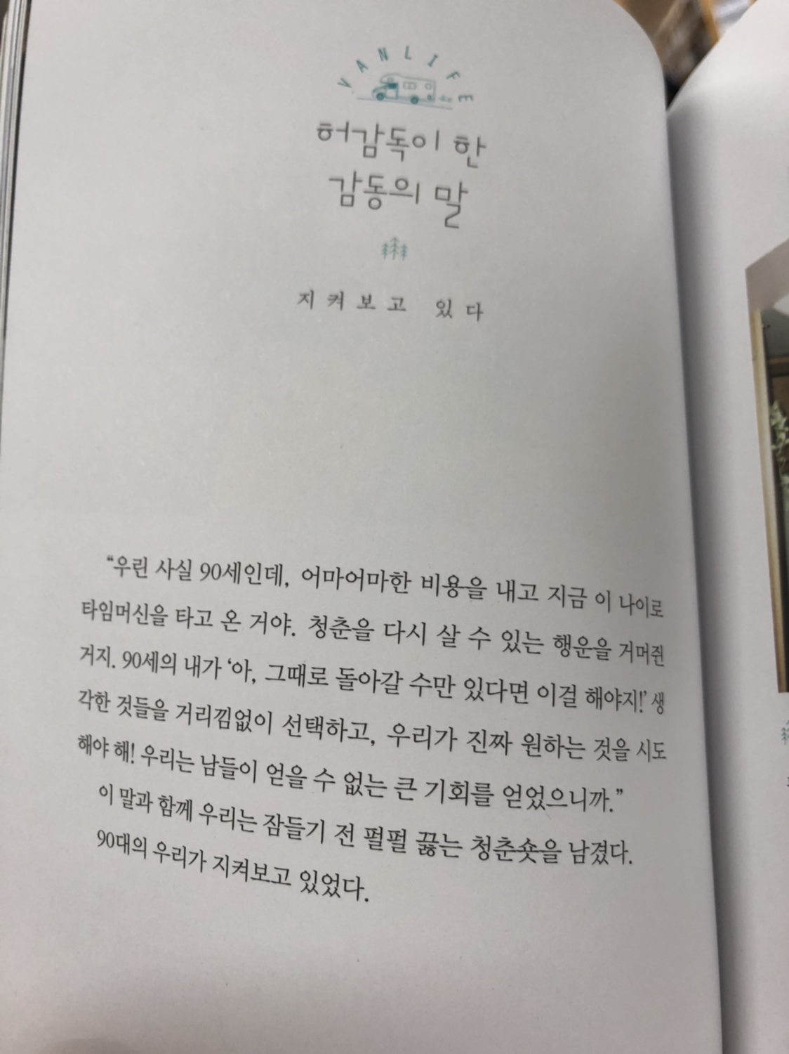 우린 사실 90세인데, 어마어마한 비용을 내고 지금 이 나이로 타임머신을 타고 온 거야. 청춘을 다시 살 수 있는 행운을 거머쥔거지. 90세의 내가 '아, 그때로 돌아갈 수만 있다면 이걸 해야지!' 생각한 것들을 거리낌없이 선택하고, 우리가 진짜 원하는 것을 시도해야 해! 우리는 남들이 얻을 수 없는 큰 기회를 얻었으니까.