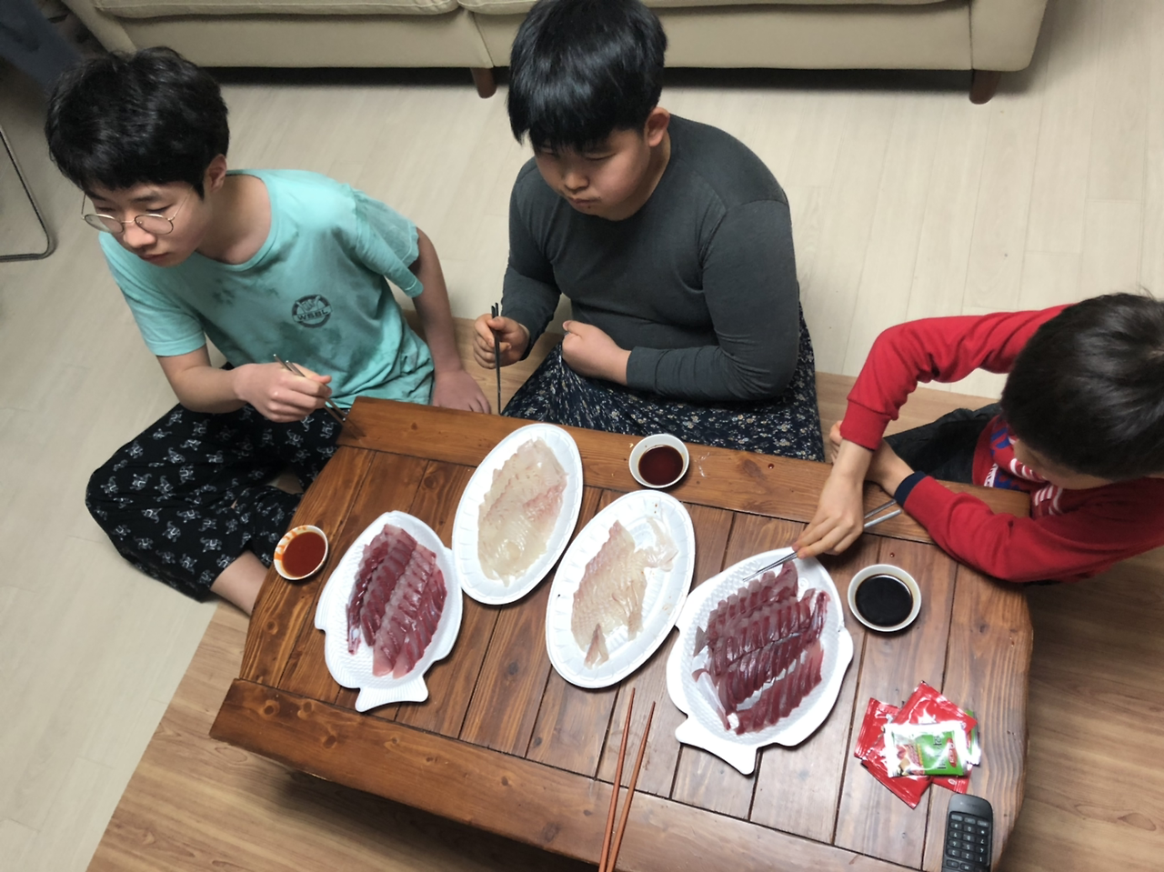 이야기가 끝나기 무섭게 막내가 좋아하는 것으로 저녁 먹자는 아이들.
