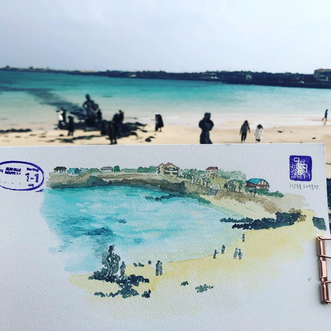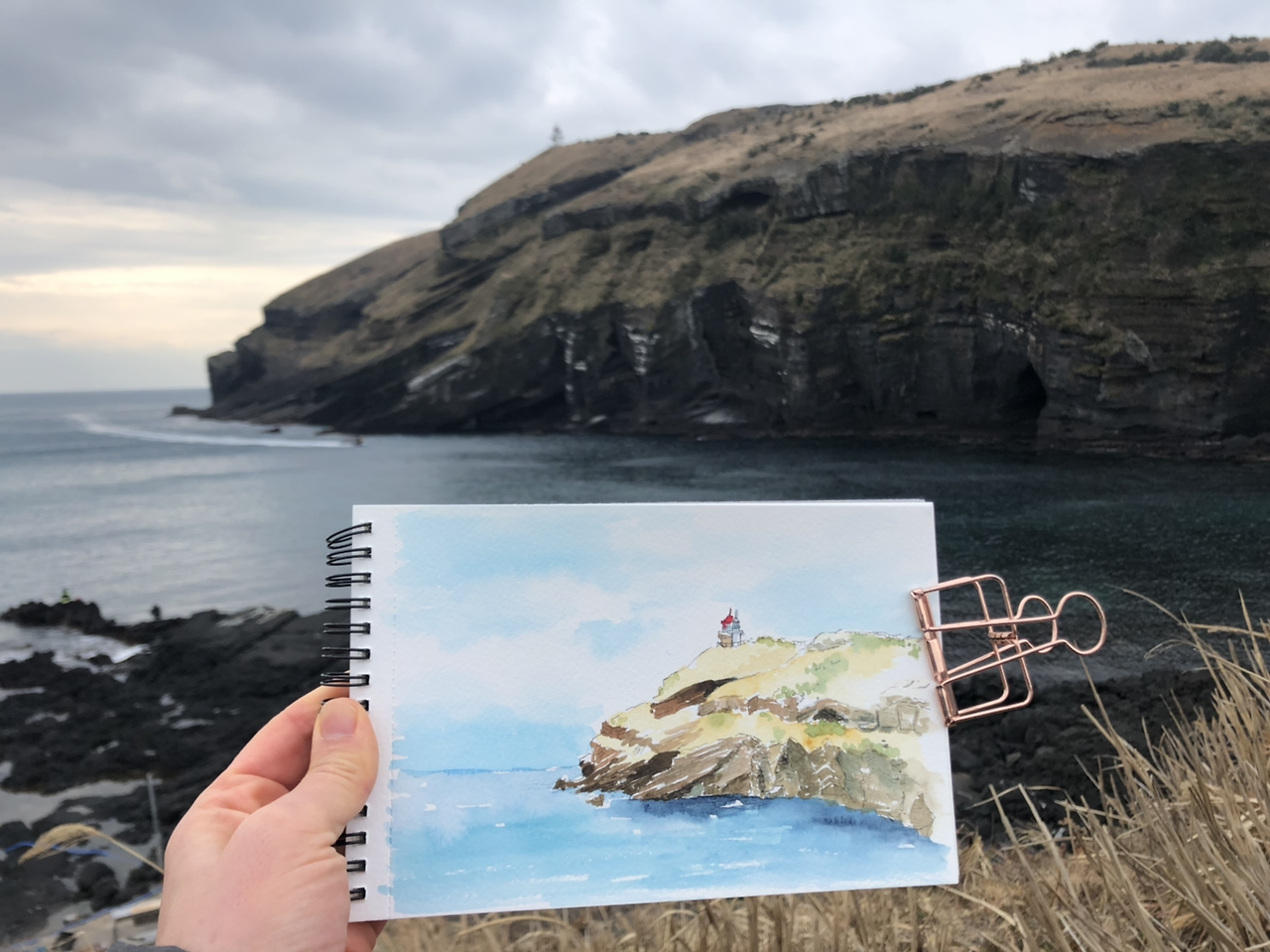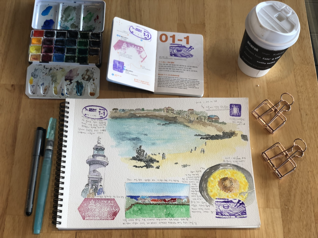 아까 그린 하고수동 해안에 어제 아이들과 함께 걸었던 우도 등대, 마을 청보리밭 풍경, 점심으로 먹은 한라산 볶음밥을 그려 넣고 1-1 코스 우도 올레 스케치를 완성한다.