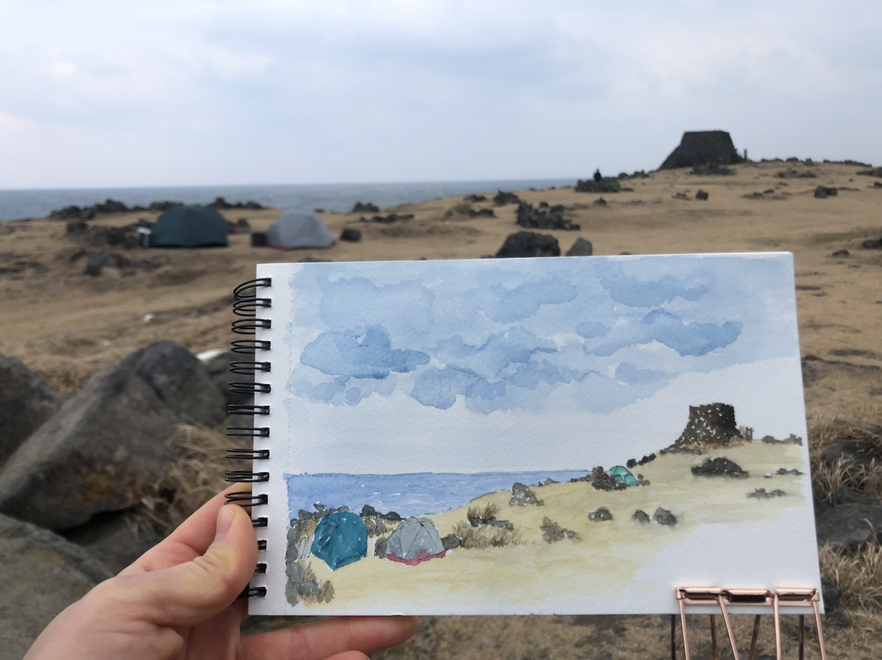 이렇게 춥고 바람부는 날에도 텐트가 세동이나 있다. 나도 캠핑하고 싶다. 아쉬운 마음을 텐트 그림으로 달래본다. 무척 추운 날씨에도 신나고 재밌는 어반스케치. #55