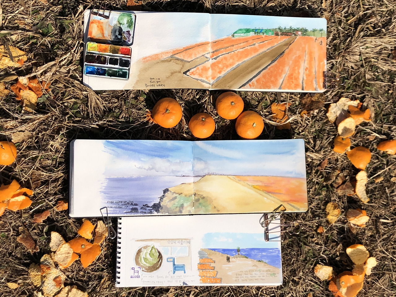 아쉽게도 울타리가 쳐져있었다. 저 귤 밭 가운데서 바다를 보며 그림을 그리면 멋있을텐데!!
