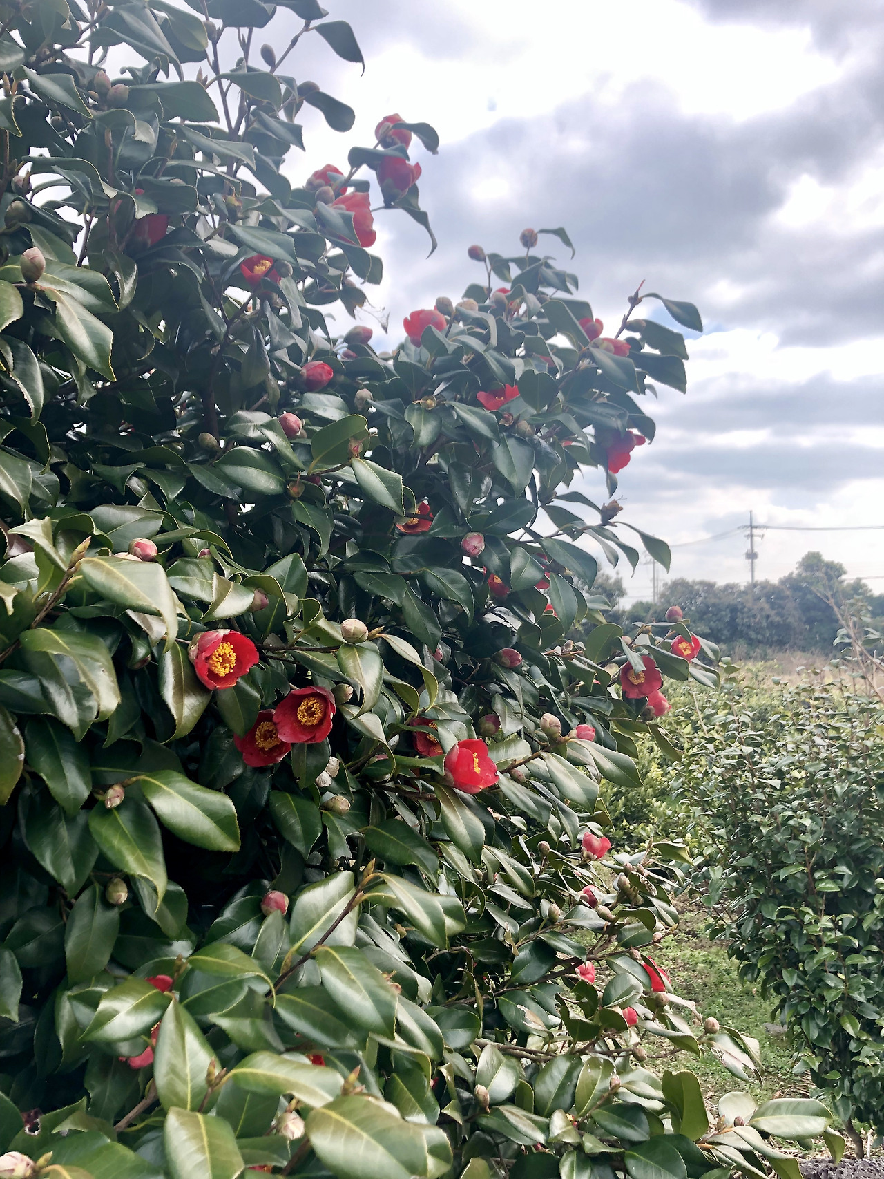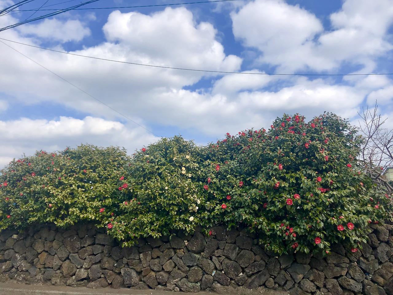 담장 너머로 나온 동백이 푸른 하늘 흰구름과 어울려 눈물나게 아름답다.