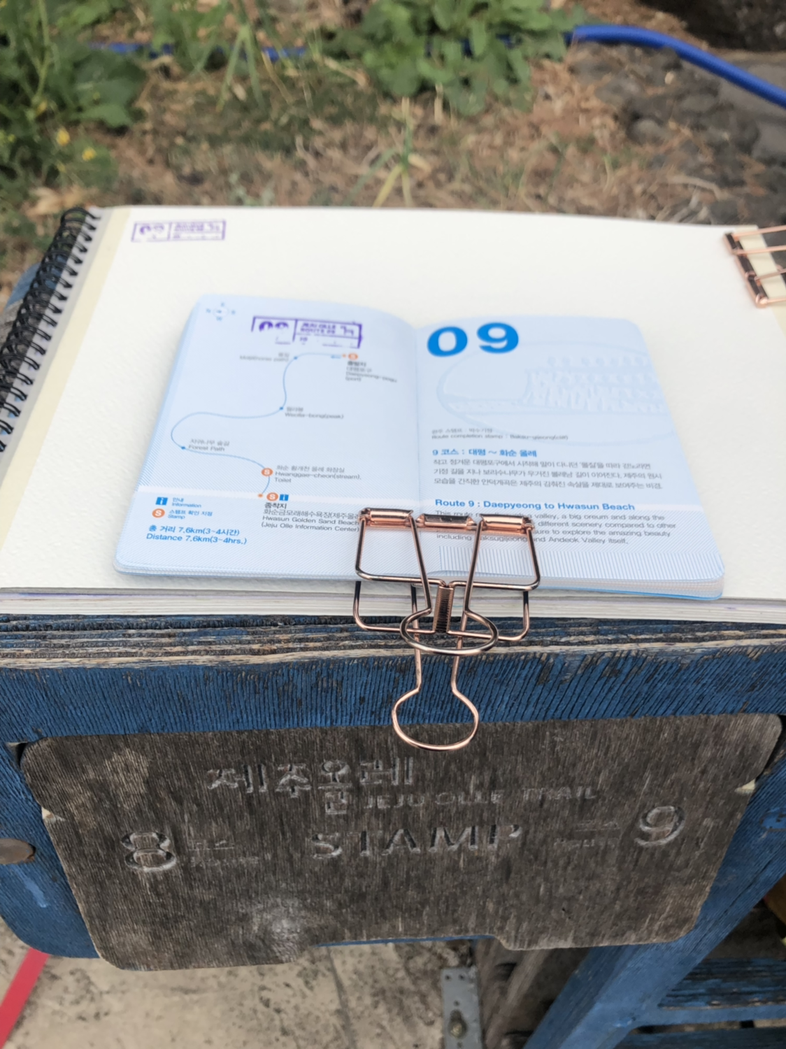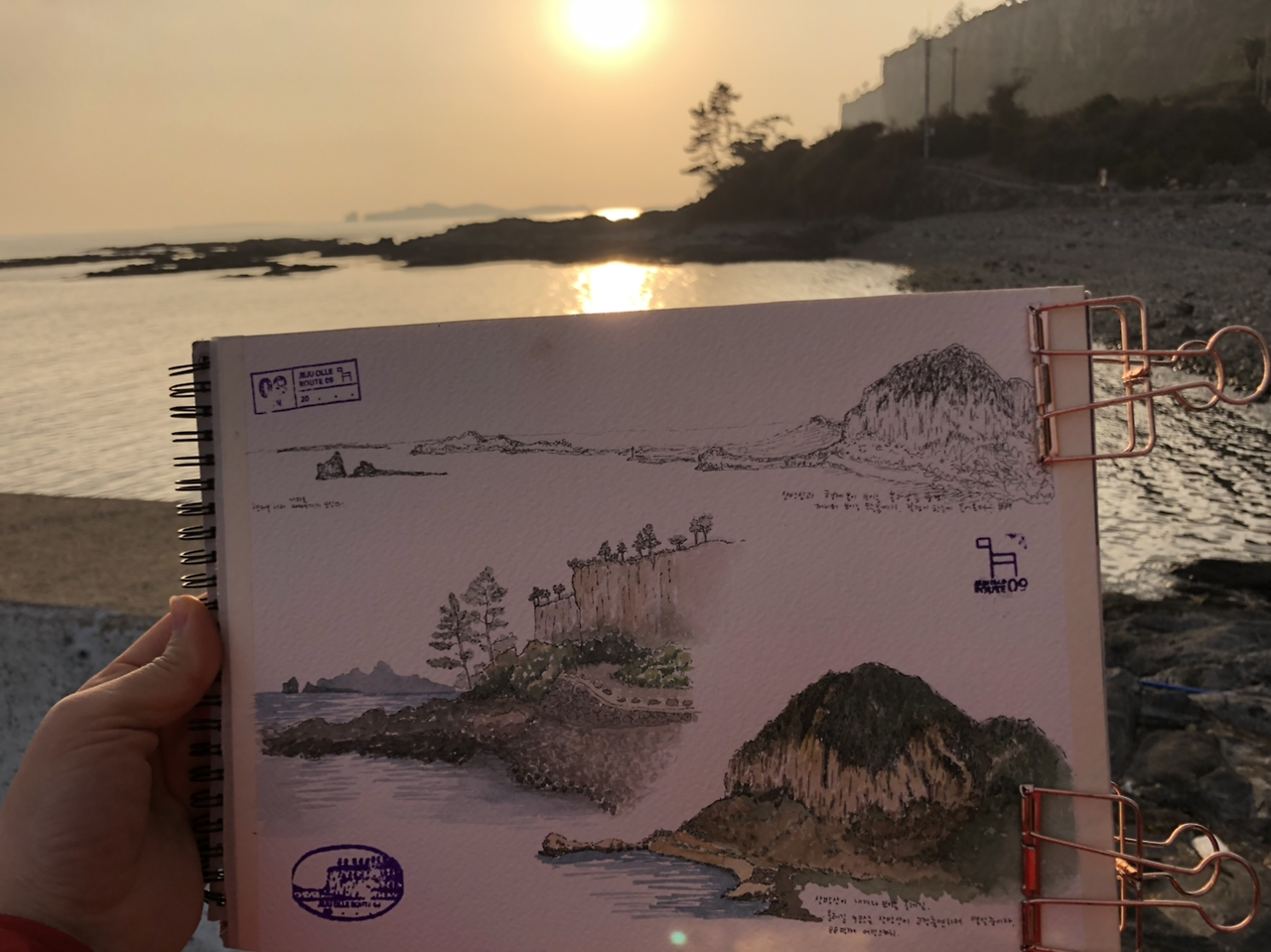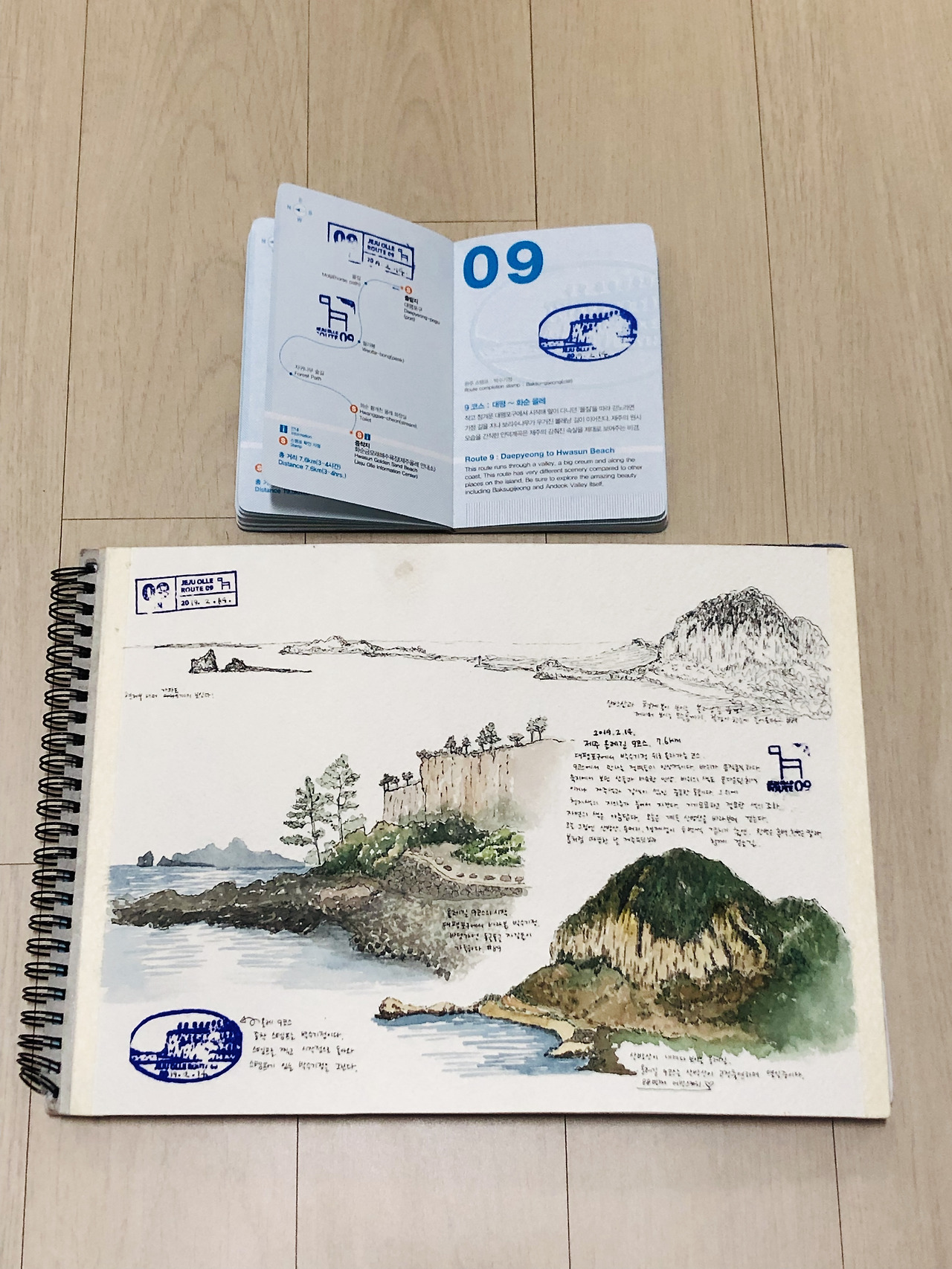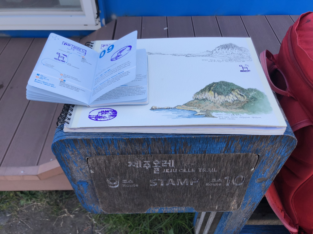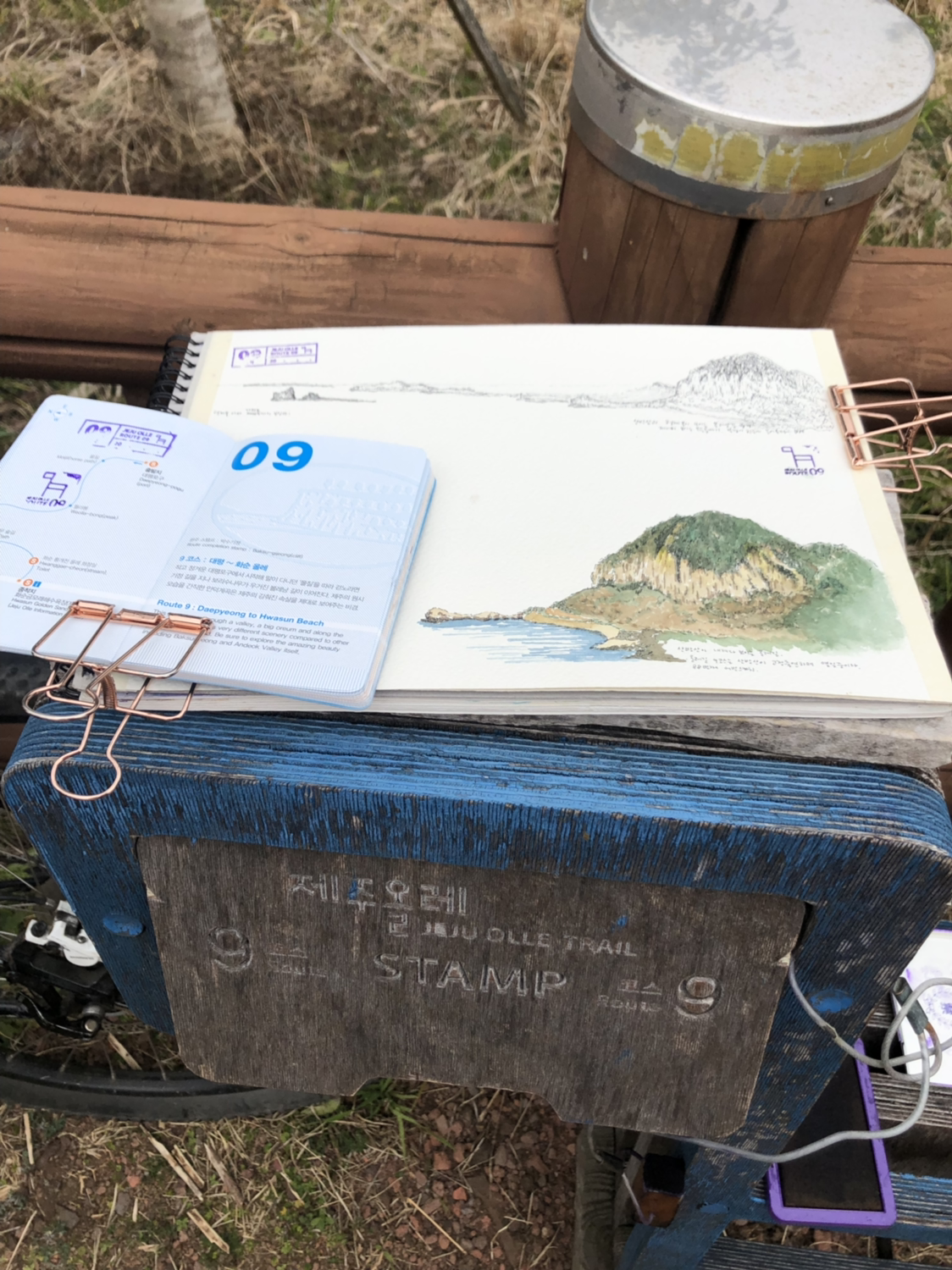 외국인 커플이 자전거를 타고와서 올레 패스포드에 중간 스템프를 찍는다. 내 스케치북을 보며 감탄한다. 나도 마주보며 배시시 웃어준다.