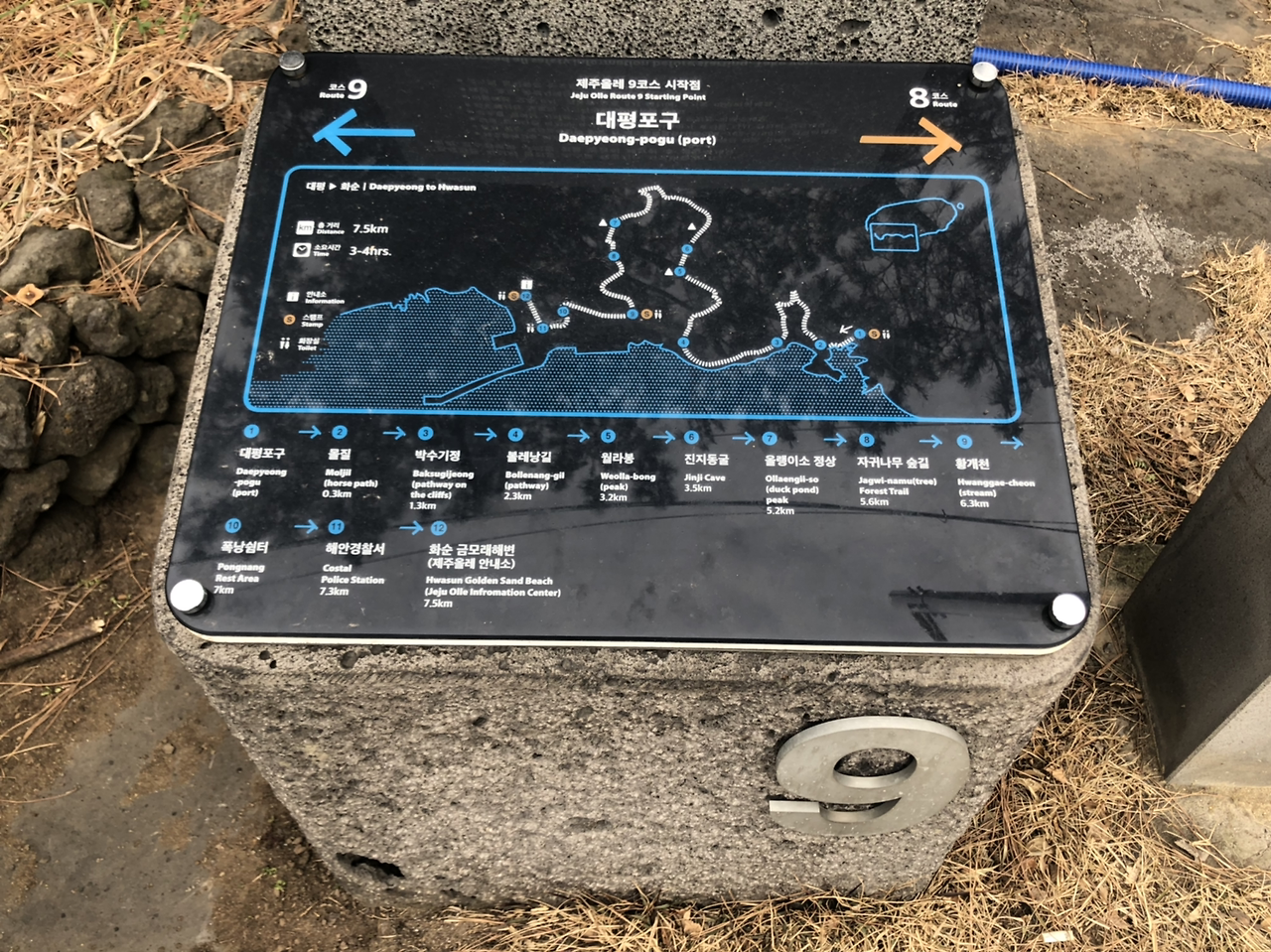 올레 9코스는 7.6km 가뿐한 거리지만 오름이 있어서 만만하지만은 않을 거라고 이야기하며 걷는다.