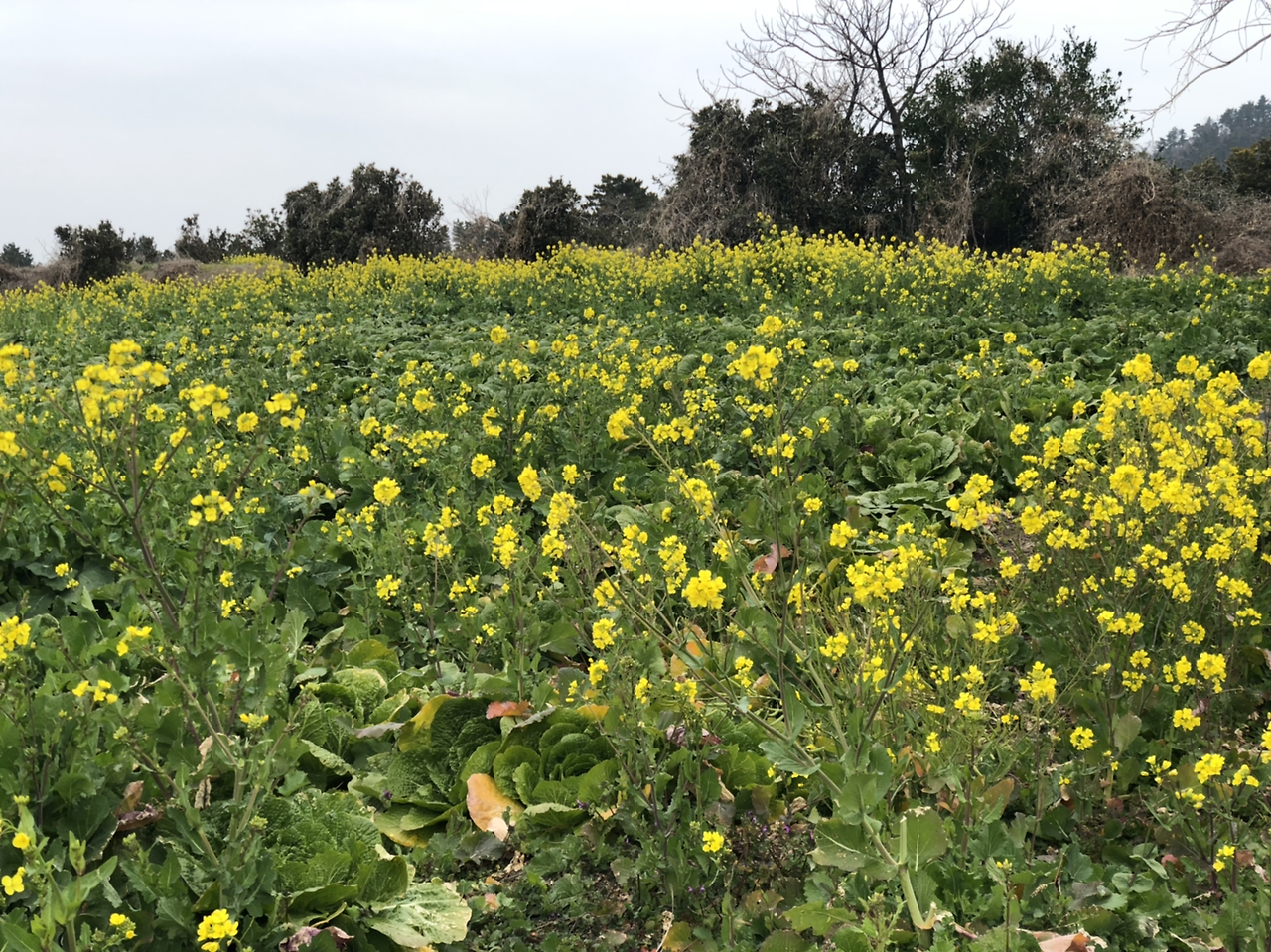 겨울 풍경이라고는 믿기 힘든 유채 꽃밭.