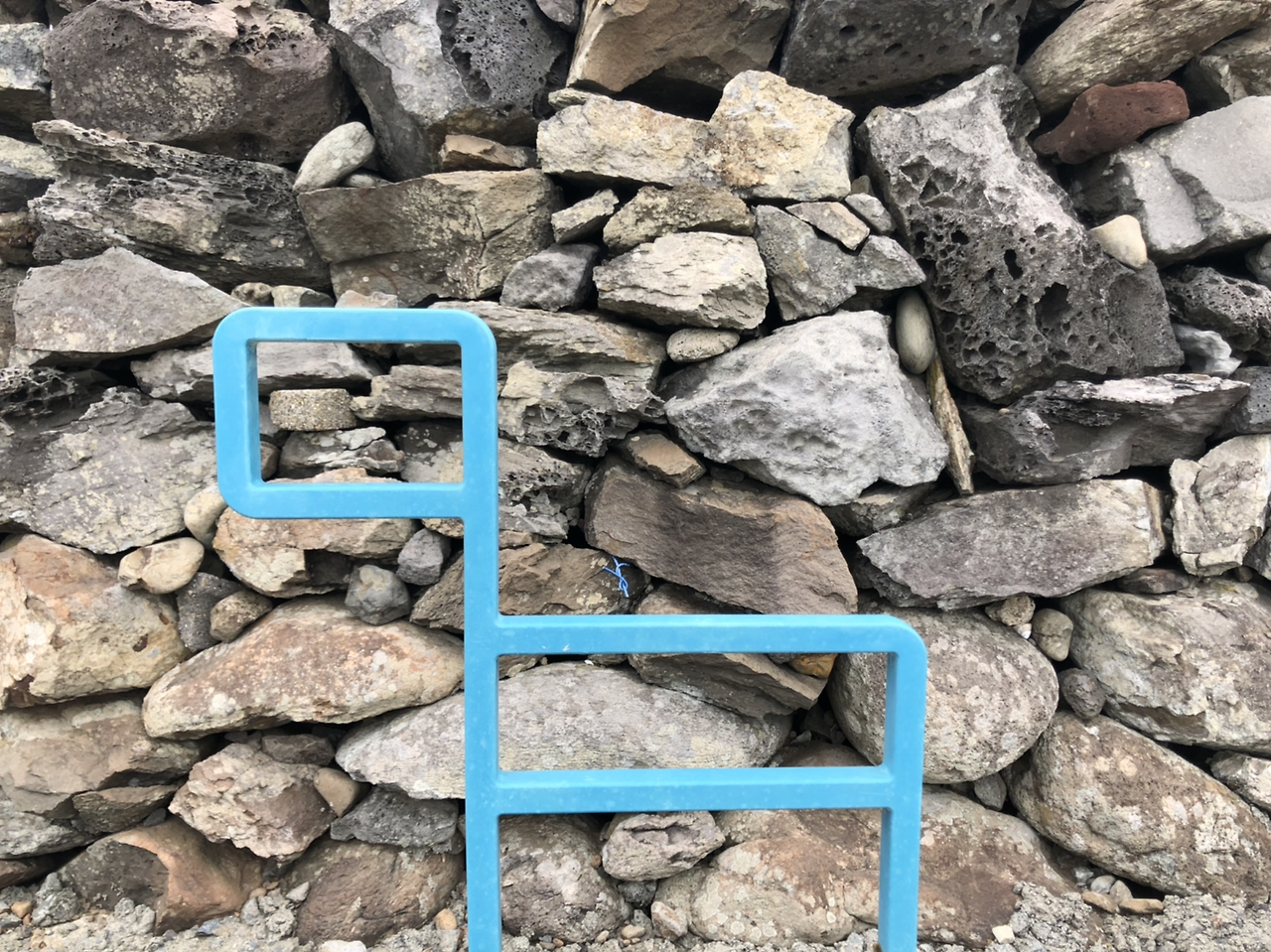 풍력 발전기, 파란 지붕 집, 섬, 색색의 돌들,,,