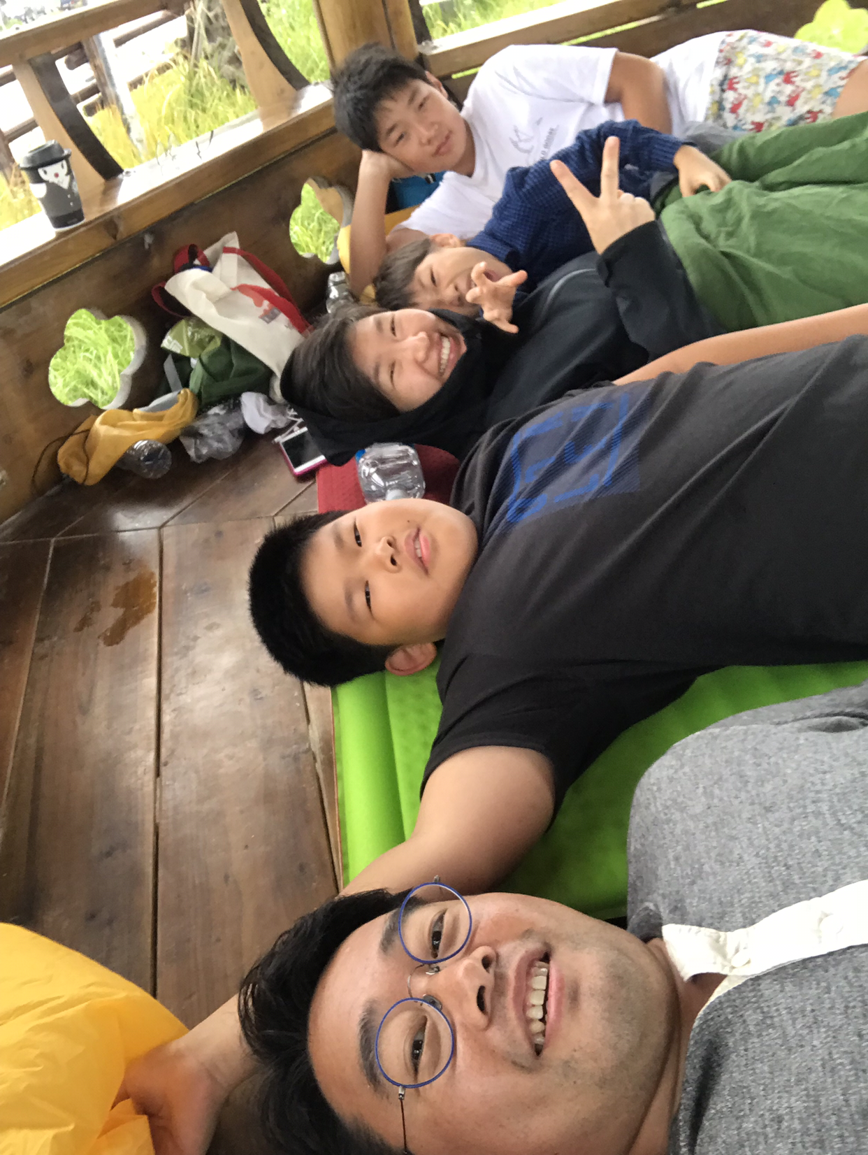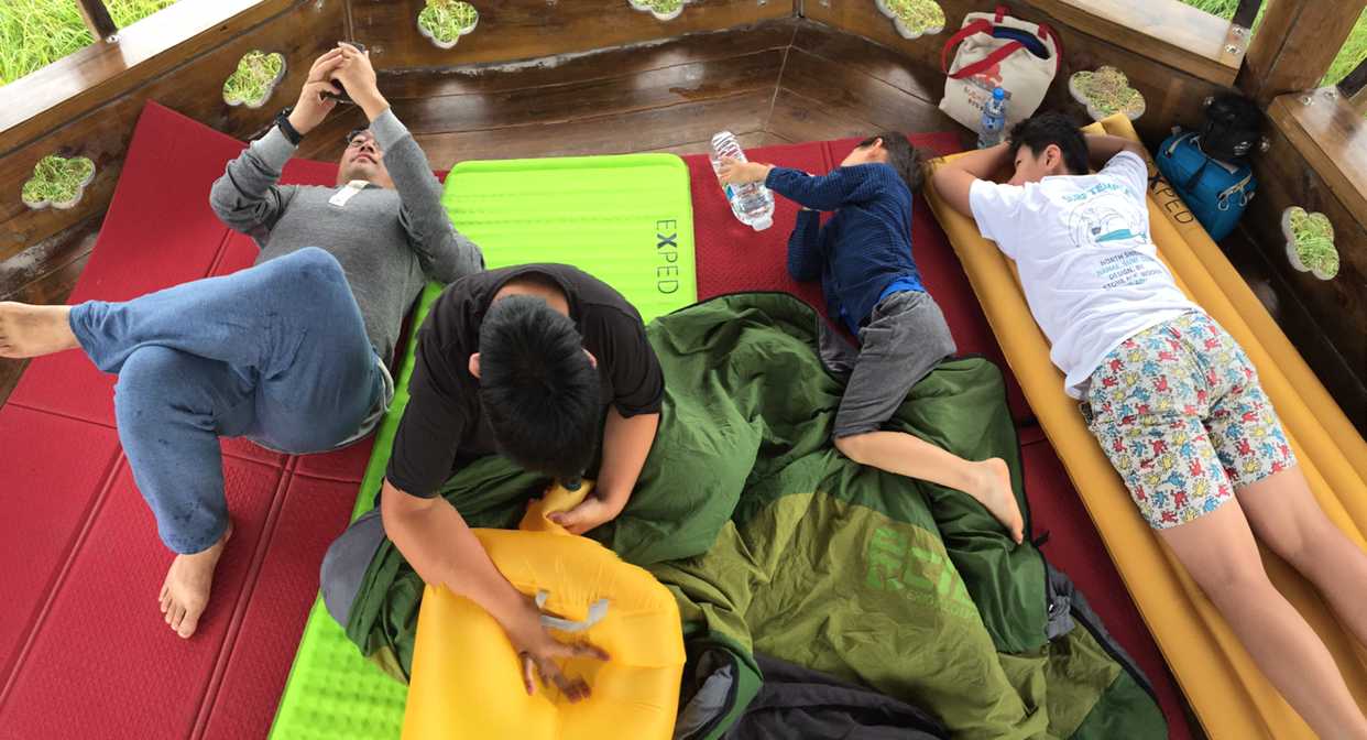 오전엔 비 오는 정자에서 따뜻한 침낭 덮고 빈둥빈둥 쉬고