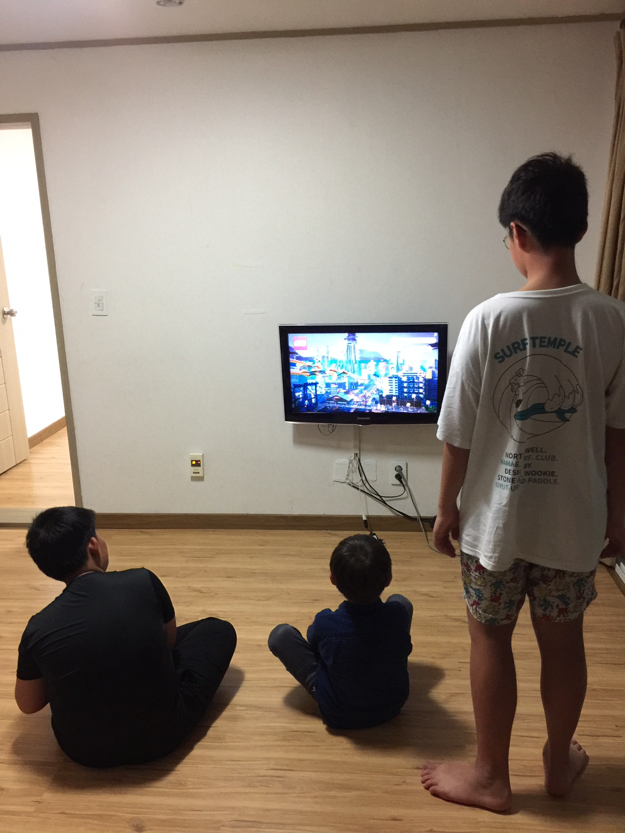 거실에서 도라에몽 보는 동안 따뜻한 방바닥에 젖은 텐트 말리기 ㅋㅋㅋ