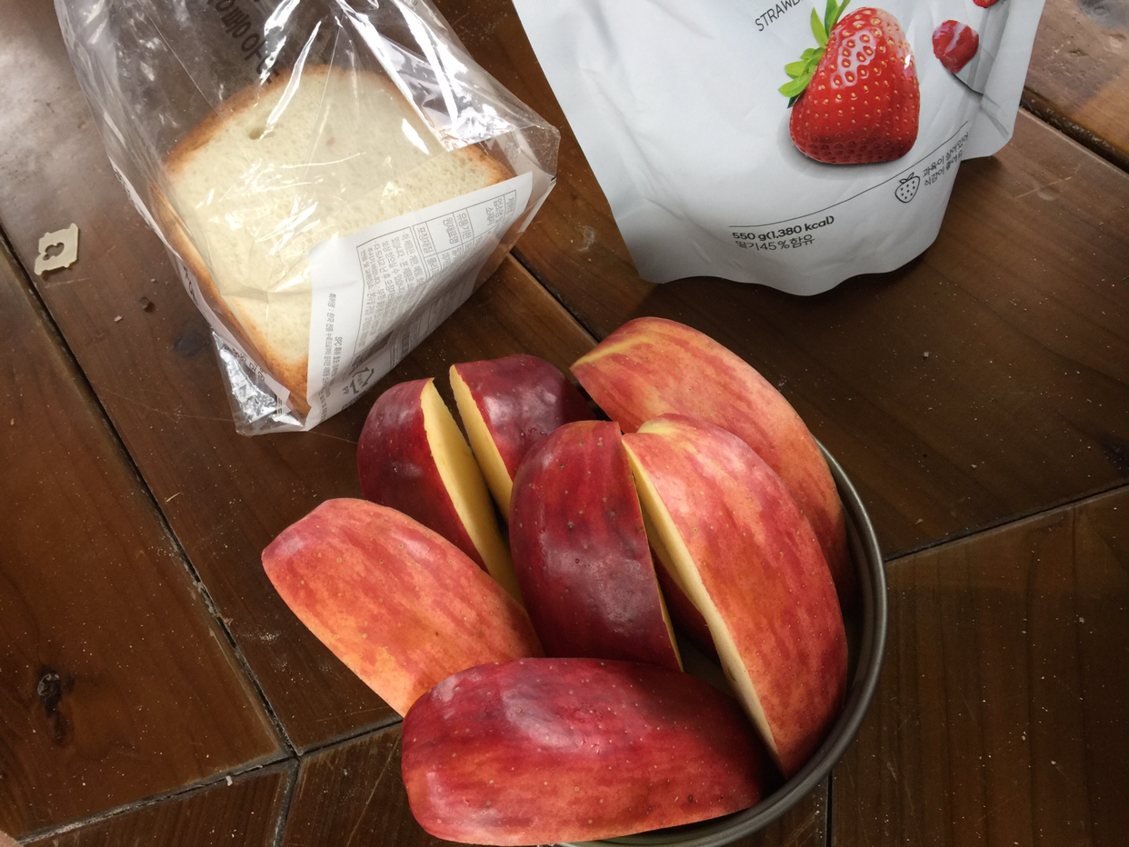 따끈한 양송이 수프, 딸기잼 바른 식빵, 사과.