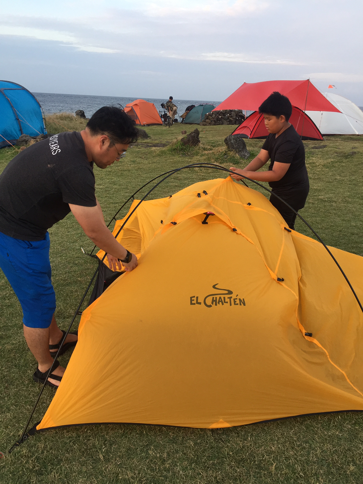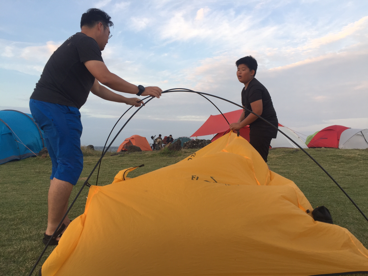 바람 많이 부는 곳에서 텐트 치는 노하우 전수받는 둘째.