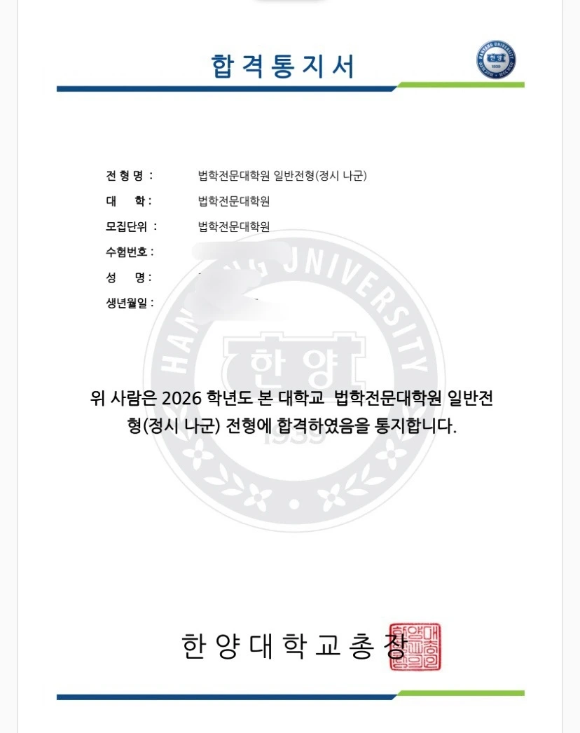 시립대에 이어 한양대 로스쿨까지 마침내 최초합격했다.