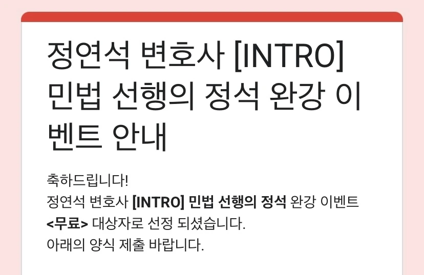 시립대 합격 이후로 민법 인트로 강의 (정연석 변호사님)를 듣고 있었는데 완강 이벤트를 하길래 참여했다.