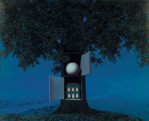 지금 이 이미지는 미술관이 아닌, 나의 가장 개인적이고 아늑한 공간 안에 있다. 나는 서서 팔짱을 끼고 수많은 관객들 사이로 언뜻언뜻 모습을 드러내는 어느 대가의 고귀한 작품을 한 구석이라도 놓치지 않기 위해 두 눈을 찌푸리는 것이 아닌, 침대 위에 누워 이리저리 굴러다니며, 이런저런 잡생각도 하며 편안하게 천장 위의 엽서 이미지를 본다. 두꺼운 나무의 몸통에는 세 개의 문이 달려 있다. 그중 첫 번째 문은 살짝 열린 상태로 안에 무엇이 있는지를 가리고 있고, 두 번째 문과 세 번째 문은 활짝 열려 있어 안의 사물인 흰 구와 불이 켜진 저택을 선명하게 볼 수 있다. 가장 신경이 쓰이는 건 두 번째 칸이다. 천장과 평행한 상태로 이 이미지를 올려다 보니 새의 알 같기도 하고 볼링공 같기도 한 흰 구가 열린 나무의 문 밖으로 굴러떨어질 것만 같다. 이 동글동글한 것이 내 얼굴 위로 떨어지기 전에 나는 그것을 두 손으로 날쌔게 잡아야 할 것이다. (꼭 그래야 할까? 몸을 굴려 옆으로 피해야 하나? 그리고 그것을 깨뜨리는 것이다.)