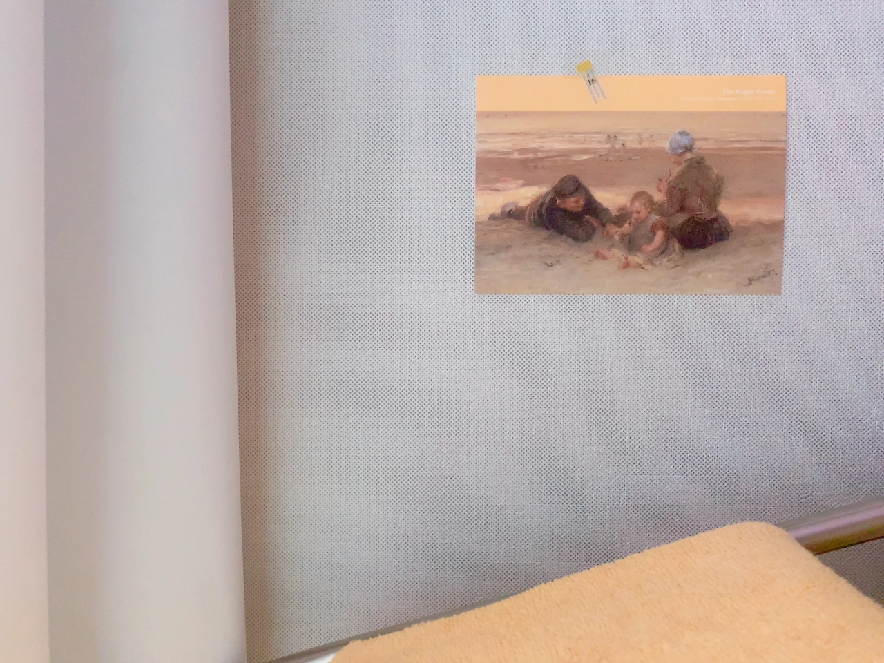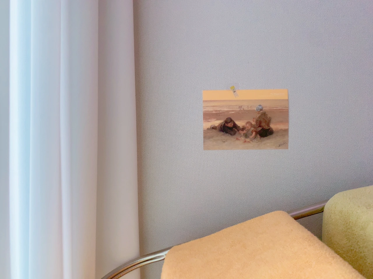 소개할 엽서는 침실에서 베란다 가까이에 있는 벽면에 붙인 것으로, 석양 배경으로 인해 노랗게 물든 해변을 그리고 있다. 모래를 뿌리며 즐거워 하는 아기, 그런 아이와 놀아 주는 아빠. 그 사이에 열심히 뜨개질을 하고 있는 엄마. 정다운 가족. 네덜란드 화가 베르나르두스 요하네스 블로메르스(Bernardus Johannes Blommers, 1845~1914)의 <행복한 가족 The Happy Family>이라는 작품이다. 낙관적인 눈으로 세상을 바라보았고 대가족의 아버지였던 블로메르스는 가정의 안락함을 그림 속에 담아내는 데 관심이 많았다. 그는 초기에 가족과 아이들이 등장하는 화창한 해변 장면을 많이 그렸다. 눈부신 단란함과 평화로움으로 가득한 그의 작품들은 네덜란드뿐 아니라 영국, 스코틀랜드, 미국으로까지 인기가 뻗었다고 한다. 그림 속 모래가 부드러운 곡선을 그리며 성실한 파도처럼, 바닷가의 시원한 바람처럼 넘실댄다. 이런 따스한 붓터치와 태양의 일정한 색감으로 통합시킨 풍경으로부터 화가가 두드러지게 표현한 것은 중앙에서 사랑스럽게 웃는 아기의 두 볼과 오동통한 발, 엄마의 등에 걸쳐 있는 의상의 체크 무늬다. 세 가족 너머로는 아이들이 활기차게 뛰놀며 바닷물과 동화된 햇볕에 스며드는 중이다.