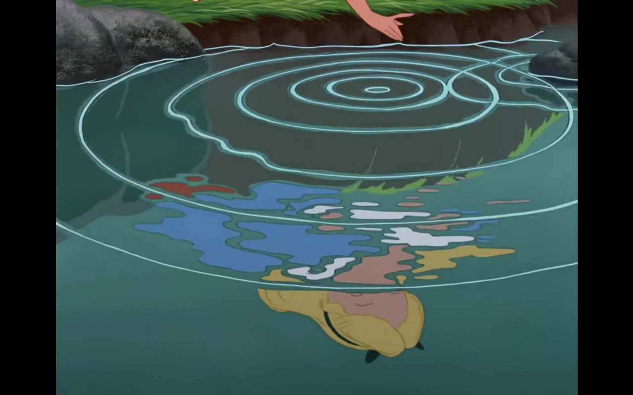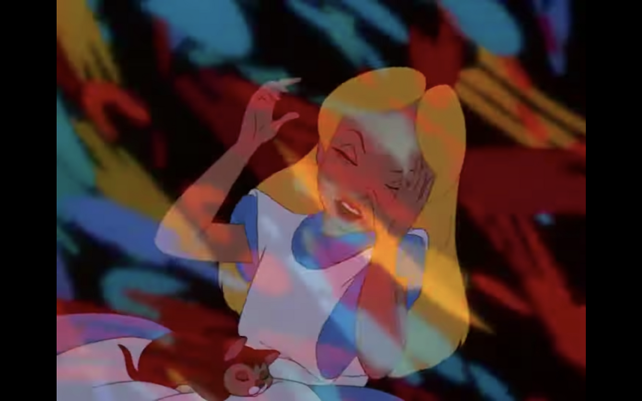 디즈니, 이상한 나라의 앨리스 : ④ 앨리스가 연못을 손가락으로 건들자 물 위의 상이 변한다. ⑤ 이상한 나라의 인물들이 알록달록한 색깔로 변하며 잠든 앨리스의 모습과 겹친다.