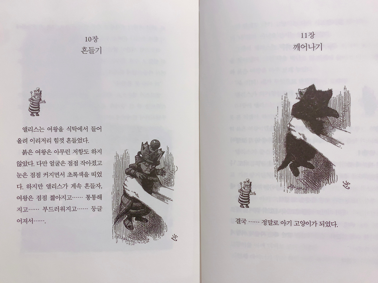 꿈을 꾼 이후, 루이스 캐럴의 원작에서 존 테니얼의 그림을 처음으로 보았을 때는 다시 그 꿈의 장면으로 돌아간 것만 같았다. 공중에 동동 떠 있는 고양이의 머리. 누구에게도 말한 적 없는, 나만 알고 있었던 내밀한 꿈이 시대를 넘어 전 세계에서 사랑을 듬뿍 받는 동화의 한 장면과 들어맞는 경험. 참으로 묘(猫/妙)하다고밖에는 달리 표현할 길이 없다. 고양이 머리 주위에 모여든 군중 속에서 사형 집행인, 왕과 여왕은 우스꽝스러운 논쟁을 벌인다. 사형 집행인은 몸이 없는데 목을 벨 수 없다고 발언하고, 왕은 머리가 있으니 목을 벨 수 있다고 주장한다. 여왕은 이 사태를 해결하지 못하면 현장의 모든 이들을 사형시키겠다고 으름장을 놓는다.