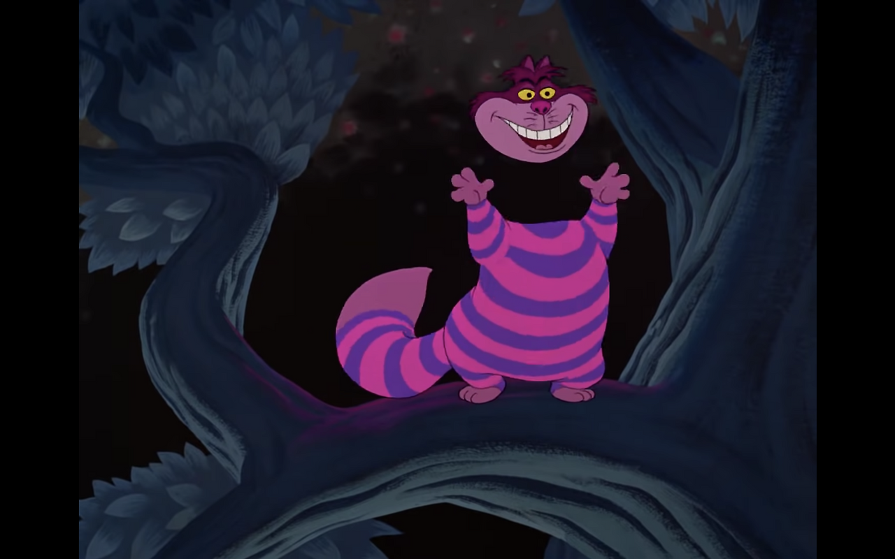 앨리스와 고양이의 이런 친근한 관계로부터 체셔 고양이를 이해해 볼 수 있을까? 앨리스와 체셔 고양이의 첫 만남으로 거슬러 올라가 본다. 디즈니 버전에서 체셔 고양이는 앨리스가 가장 궁금해 하는 것, 흰 토끼의 행방에 대해 말한다. 또한 그는 이상한 나라의 기본적인 법칙, 이곳의 모든 사람들이 미쳤다는 진실을 알려 준다. 심지어 그는 스스로가 미쳤다는 자각도 있다. 체셔 고양이가 이상한 나라의 다른 동물들에 비해서 유독 두드러지는 존재감을 갖는 데에는 신비로운 재주와 거대한 머리도 한몫 했겠지만, 그가 스스로의 정체성을 의식하고 있으며 앨리스와 대화다운 대화가 가능한 유일한 인물이라는 점도 있다.