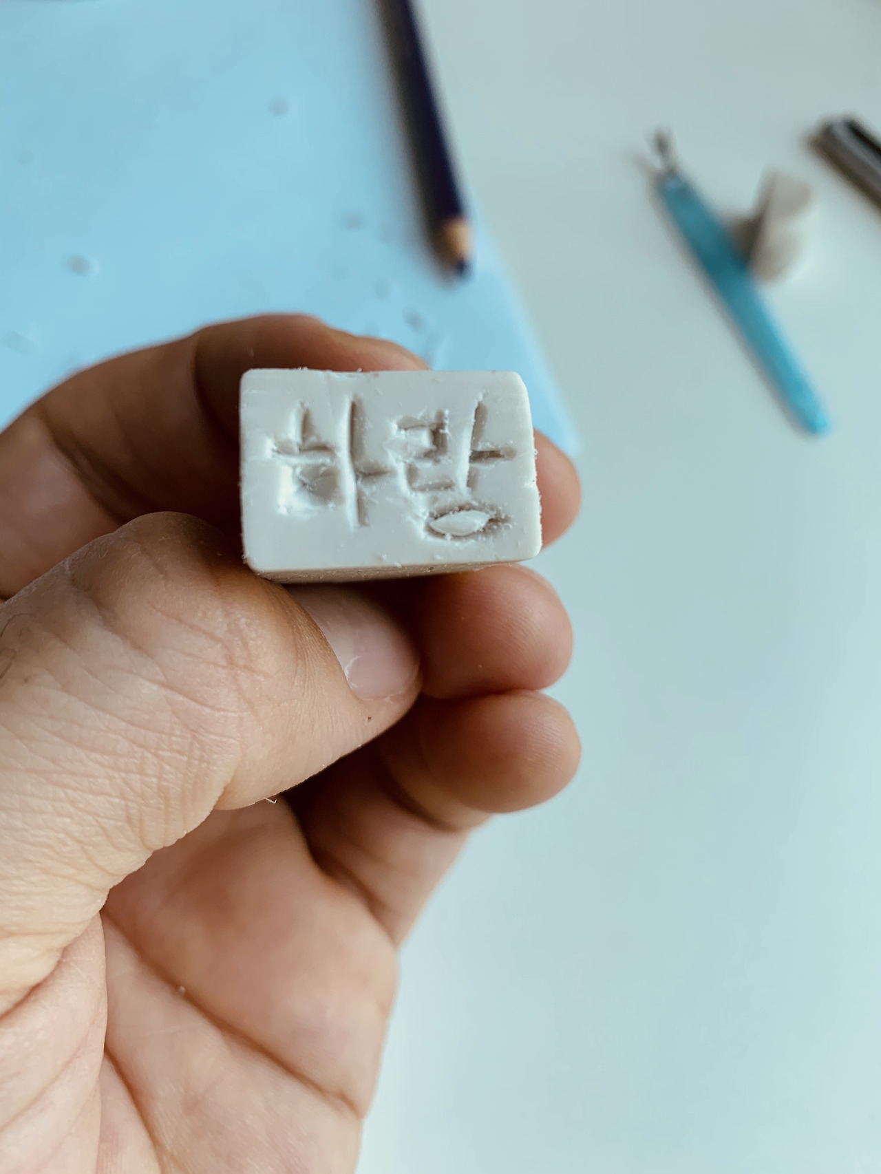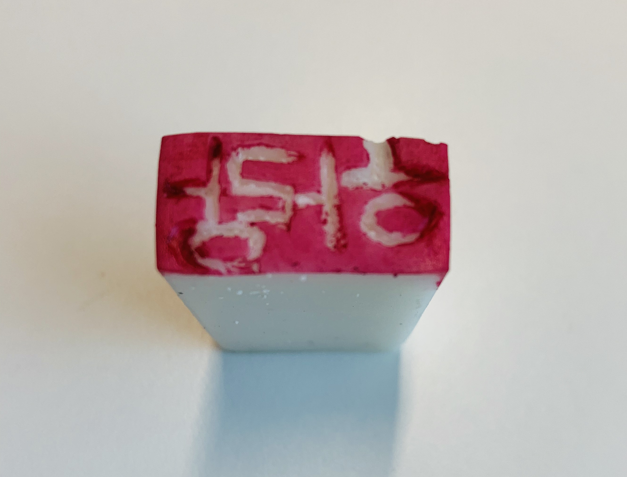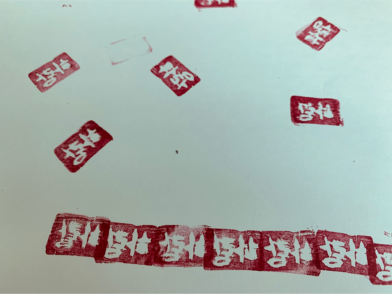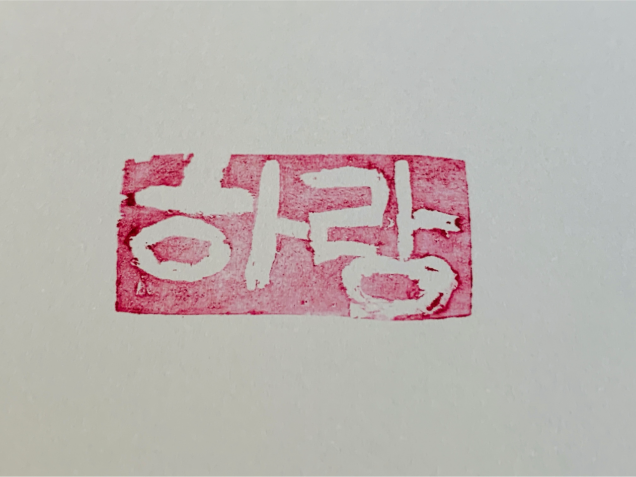 아빠 엄마가 언젠가 쓰다가 남았을 지우개 하나를 찾아서 음각으로 작업을 시작했다. 아빠는 판화의 기본도 모른 채 보이는 대로 글씨를 썼는데 인주를 묻혀 찍고 나서 알았다.