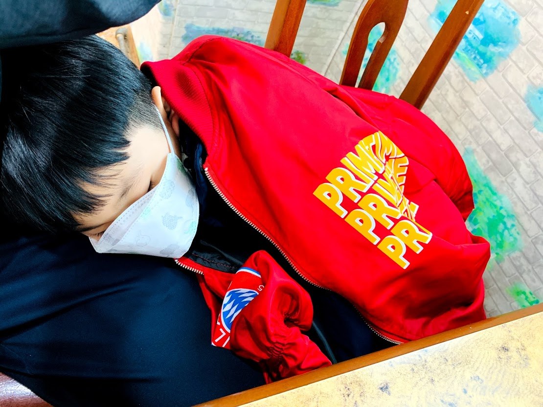 그렇게 우리는 택시, 공항 대기, 비행, 숙소 이동이라는 장시간 여독을 제대로 풀지도 않은 채 바닷가에서 두 시간을 넘게 놀았다. 부들부들 떨면서 춥지 않다는 아이를 연행해오듯 둘러업고 숙소에서 씻고 옷을 갈아입은 뒤에 숙소 바로 앞에 있는 맛집 리스트에 없는 작은 현지 식당에 갔다. 주력 메뉴가 있는지 살펴보고, 아이 입맛에 실패가 없는 고기국수와 고등어를 시켰다. 주문하는데 고작 2분 남짓 걸렸으나 아이는 잠이 들어있었다.