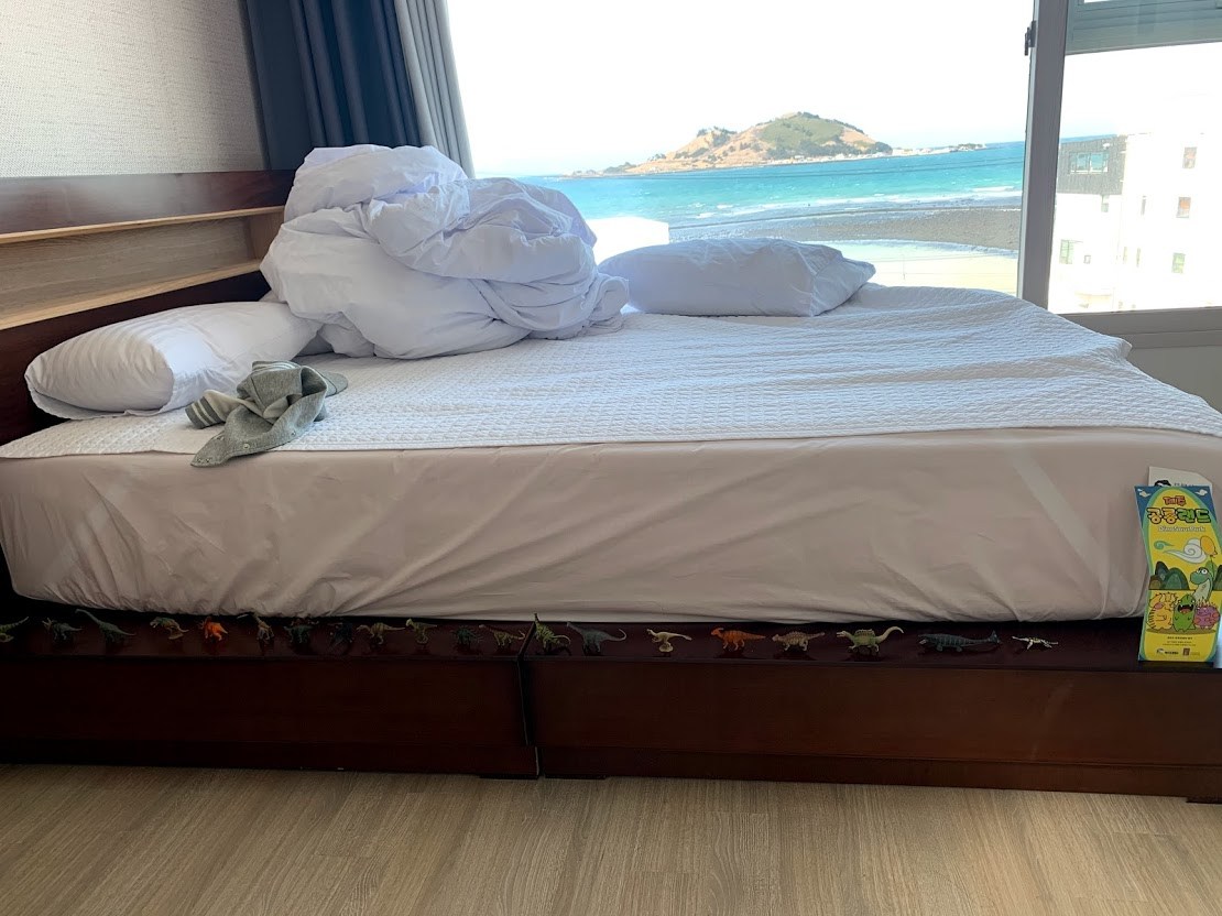 어제 집에서 공항까지 한 시간, 김포공항에서 한 시간 반, 비행기 안에서 한 시간, 제주 공항 내려서 숙소까지 한 시간 반. 총 5시간 걸려서 제주도에 왔는데, 이 아름다운 제주도까지 공룡을 보러 온건 아닌데 난감했다. 고작 3박 4일 일정으로 제주도의 구석구석을 모두 탐방하겠다고 계획한 것은 아니지만, 최소한 바닷가, 감귤농장체험, 용암동굴, 오름, 향토 음식 몇 가지는 아이와 함께 경험하고 싶었다. 내륙 지방에서는 느낄 수 없는 정취, 화산지대의 독특한 형질, 해녀 할머니들이 잡아오는 해산물 요리 등 아이와 제주의 다양한 주제에 대하여 이야기를 나누고 경험을 하게 하고 싶었다.
