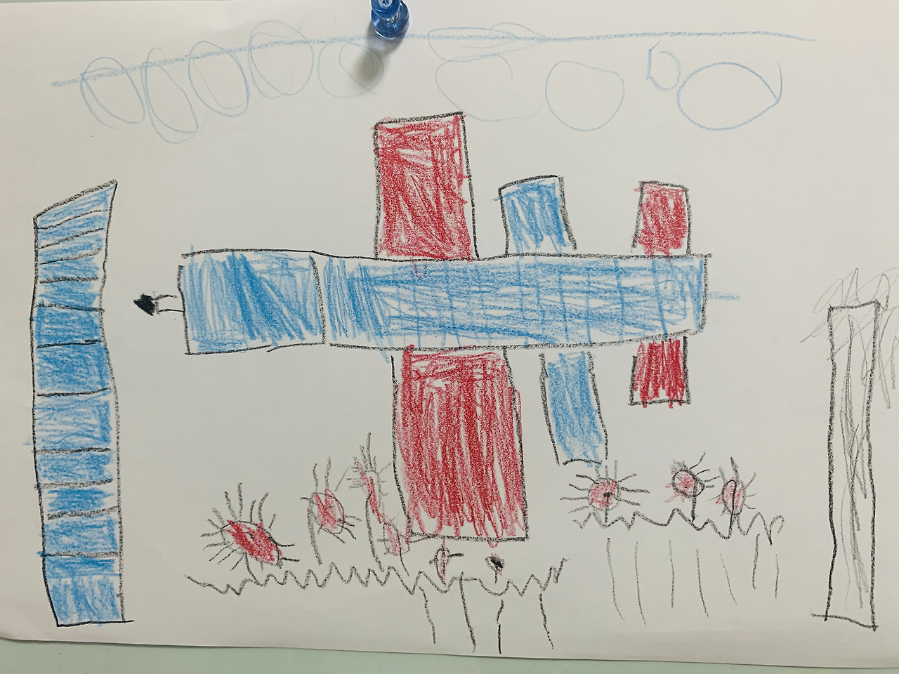 빨간색만 날개라고, 파란색은 날개가 아니라 건물이라고 작가는 해석을 당부했다. 원근법을 아직 안배우셔서 그런가보다. 하늘에는 뭉개구름이 잔뜩하며, 땅에는 5월의 장미가 가득하다.