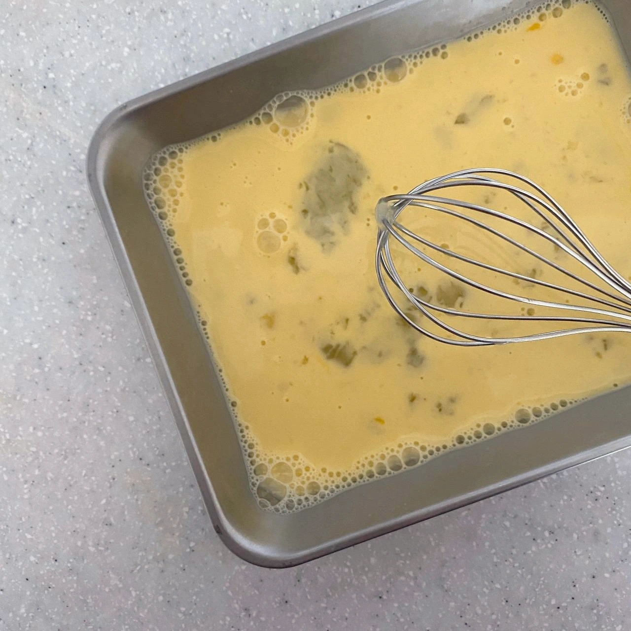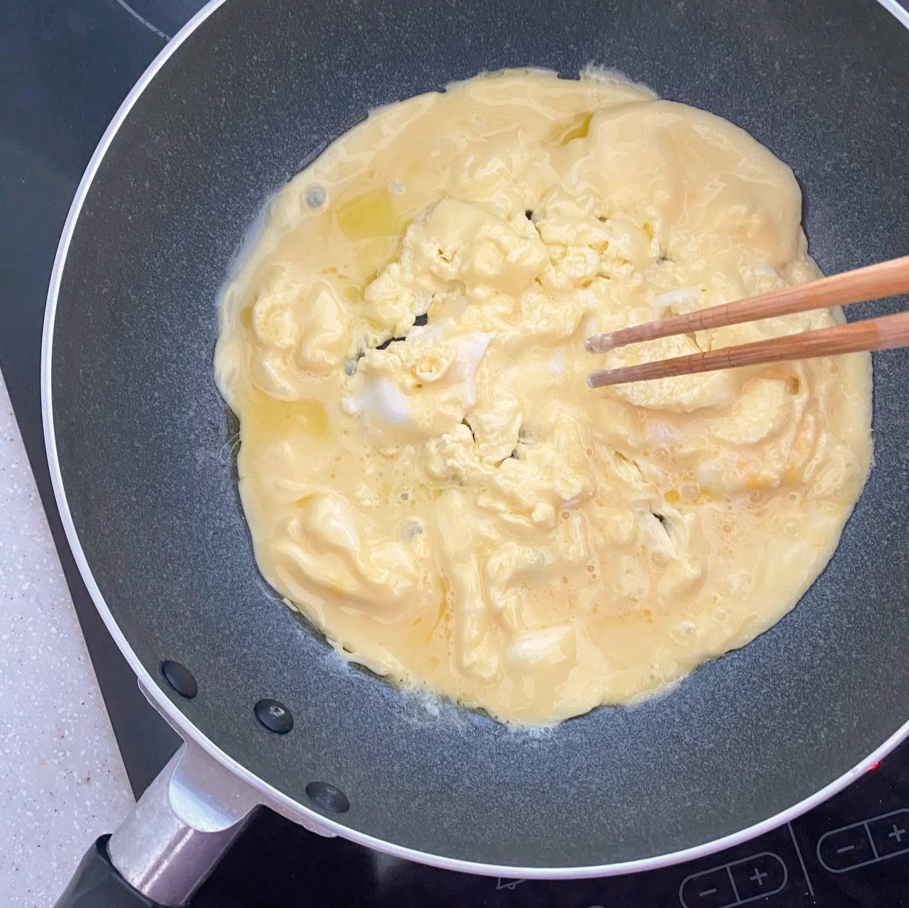 올리브유를 두른 팬이 예열되면 달걀물을 부은 뒤 젓가락을 이용하여 몽글몽글하게 휘저어 준다.