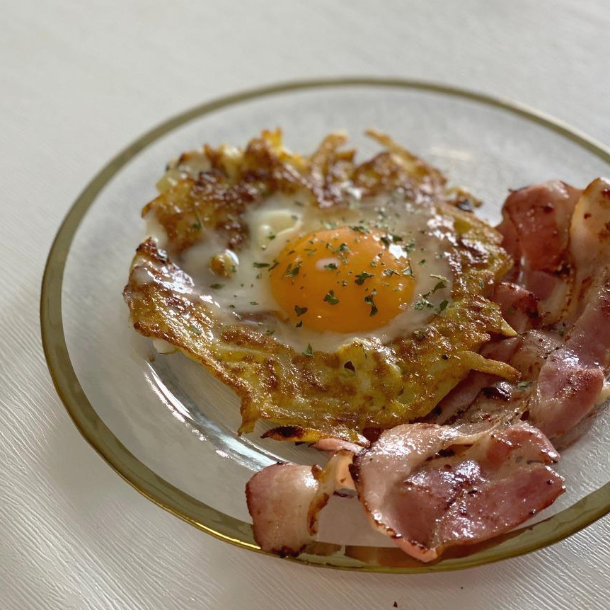미리 구워 둔 베이컨을 접시에 올리고 가운데에 에그 인 해쉬브라운을 놓아준다.
