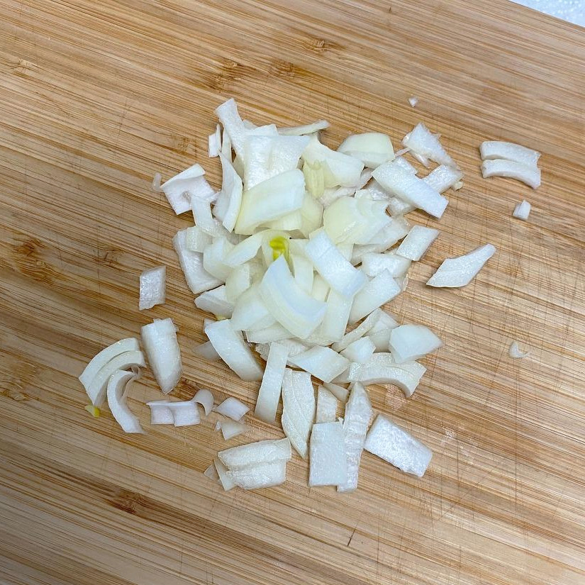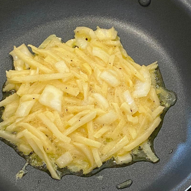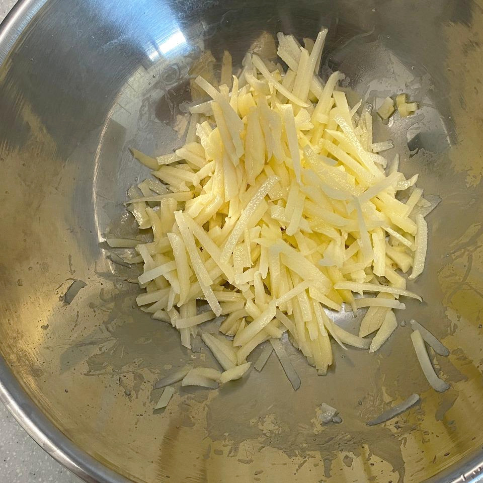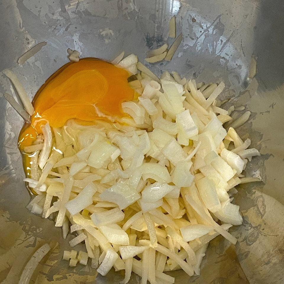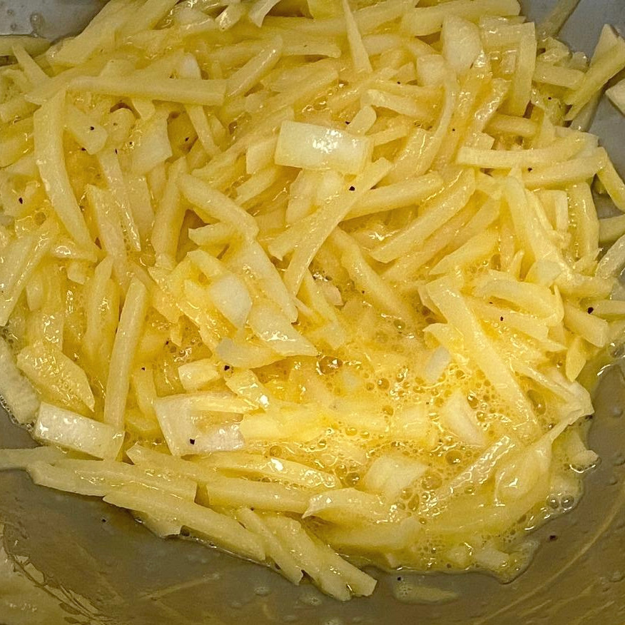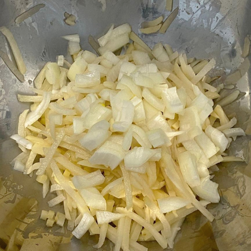 채 썬 감자가 담긴 볼에 다진 양파를 넣어준다.
