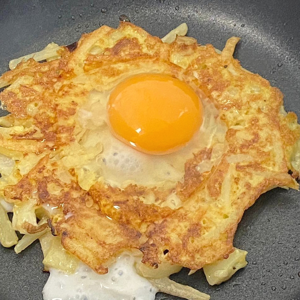 구멍을 낸 해쉬브라운에 달걀 하나를 쏙 넣어 구워준다.