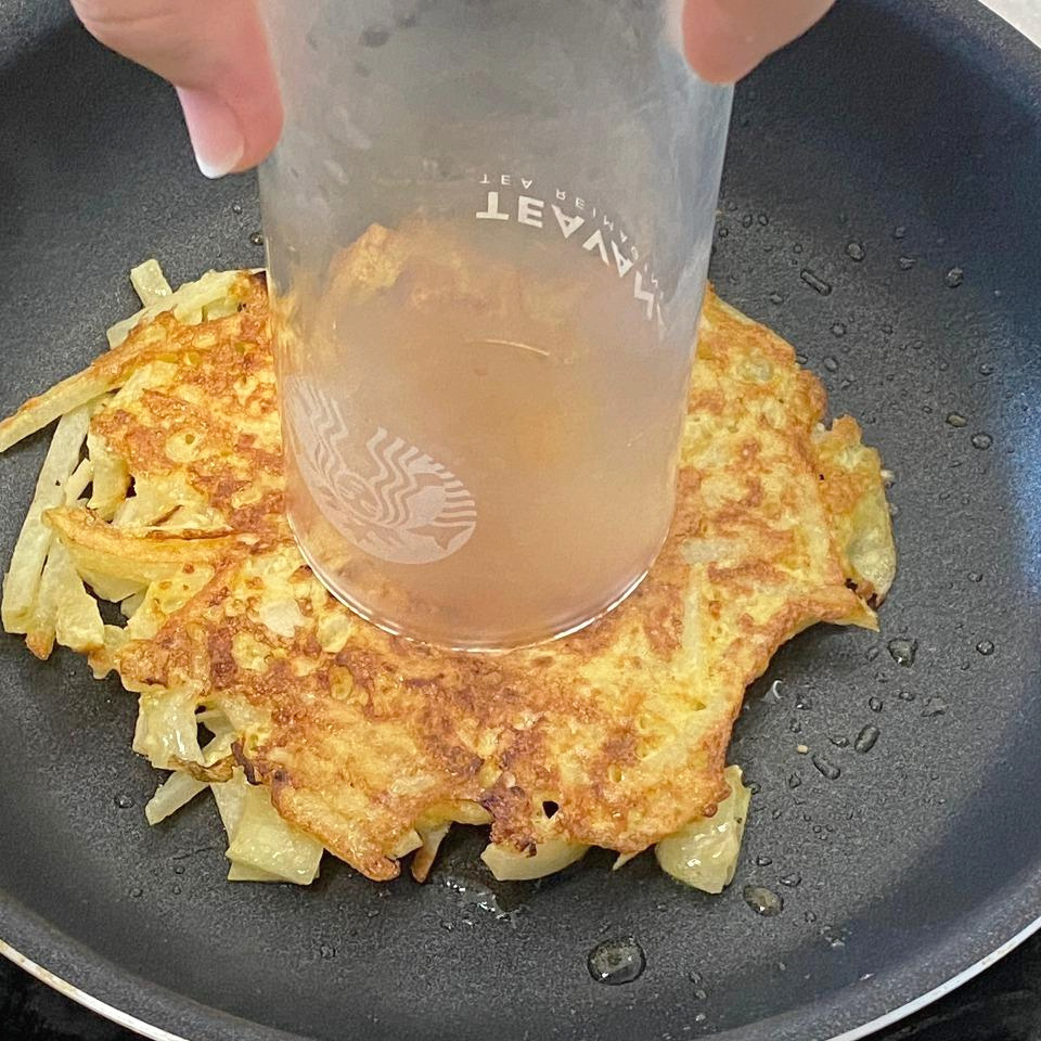 올리브유를 두른 팬에 버무려진 감자를 동그랗게 올려 구워준다.