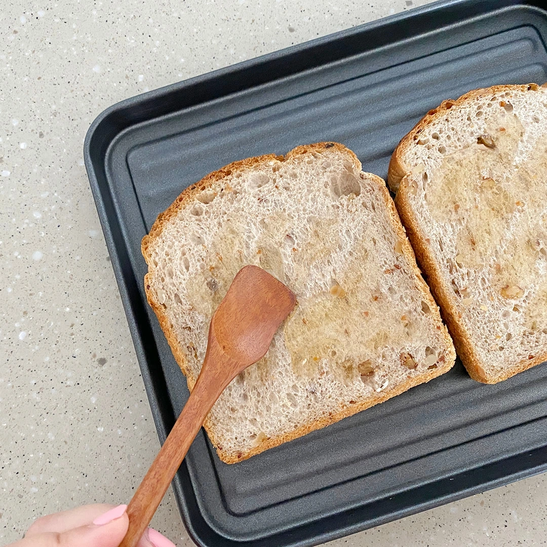 잡곡빵 위에 꿀을 펴 발라준다.