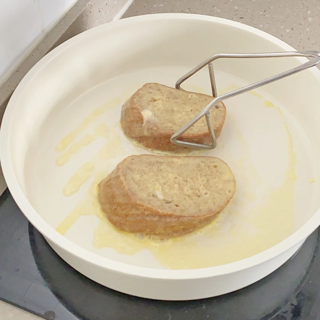 버터를 두른 팬에 빵을 앞 뒤로 움직여 노릇하게 구워준다.