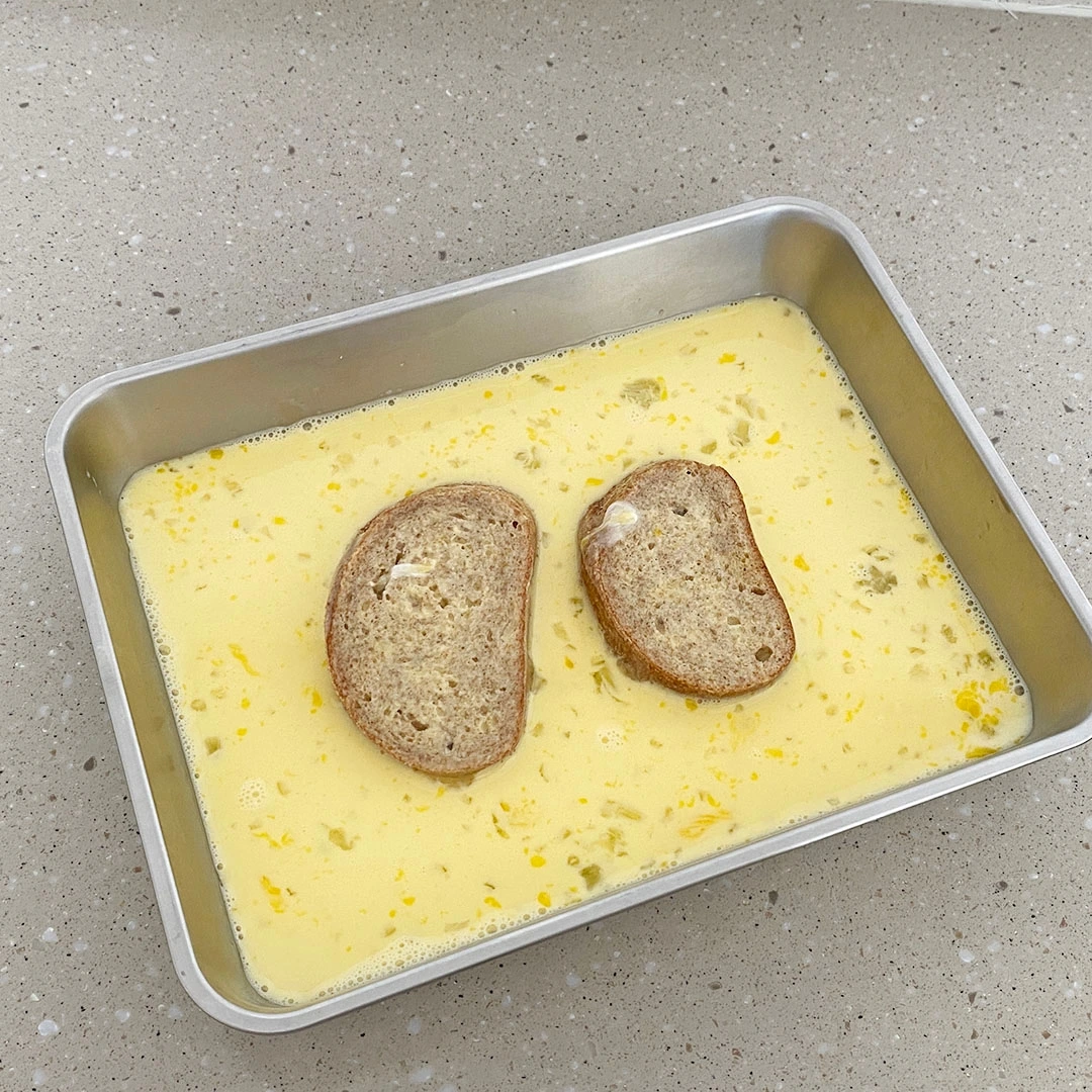 먹을 수 있을 정도로 슬라이스 해둔 빵을 달걀물에 넣어 앞뒤로 충분히 적셔 준다.