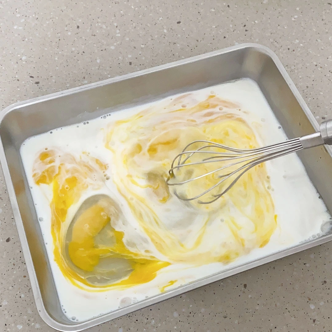 넓은 플레이트에 달걀 3개, 우유 1컵 (240ml), 설탕 1 큰술을 넣고 믹싱해 달걀물을 만들어준다.
