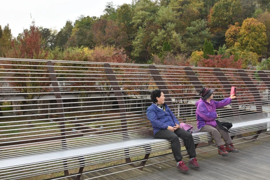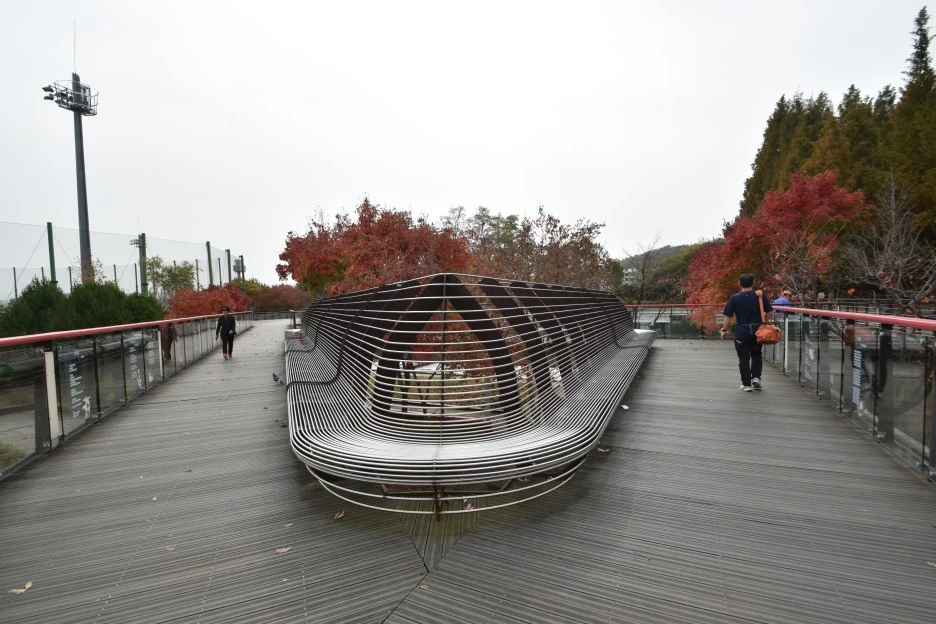 또 2층 하늘로엔 호수를 전망할 수 있는 철제로 만든 긴 의자가 설치되어 있다. 앞에서 보면 비행기 같다. 여기에 앉아 이야기 나누는 사람은 비행기에 탑승한 승객이 될 터이다. 그러니 여유로운 마음으로 잠시 허공에 걸린 시를 읽거나, 발아래 내려다보이는 호수공원의 멋진 풍경을 감상해 보라.