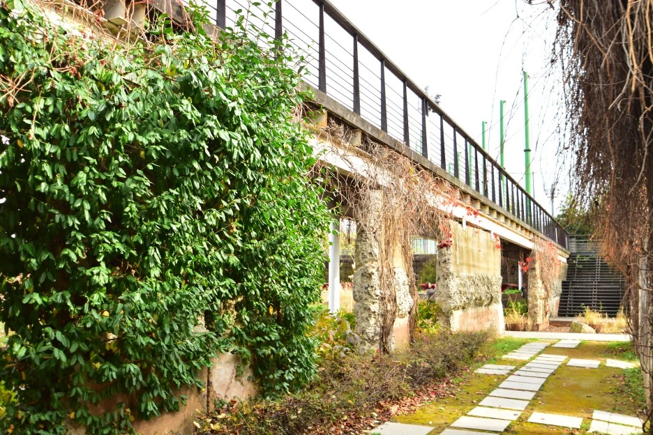 이 정원 상부 2층 옥상정원에는 폐허처럼 노출된 철근 콘크리트 기둥을 타고, 담쟁이덩굴이 늠름한 기세로 뻗어 있다. 날마다 풍화하는 기둥에 기대어 보란 듯 성장해 가는 것이 아름다운 청년을 보는 듯하다.