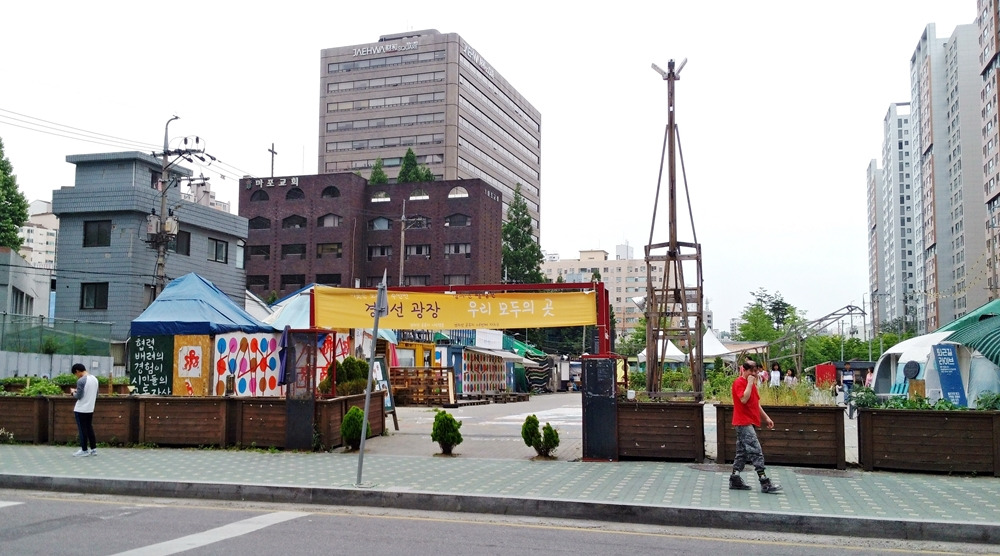 공덕역 인근에 경의선 철길을 따라가다 보면 컨테이너 건물들이 들어서 있는 공간이 있습니다. 사회적 기업들이 모여서 시민들을 위한 벼룩시장과 다양한 주민커뮤니티 활동을 펼쳤던 공간으로 몇 해 전까지 ‘늘장’이라는 이름으로 운영되던 곳입니다. 시민들의 공유지로서 재미있는 쓰임새를 보여주었던 이 곳 역시, 한국철도시설공단이 대기업에게 장기 사용권 넘겨주고 대규모 개발을 앞두게 되면서 운영이 중단되었습니다. 2016년 2월, 문화연대는 도시 속 공유지를 지키고 싶은 여러 개인, 단체들과 함께 ‘경의선 공유지 시민행동’이라는 네트워크를 만들었습니다. 그리고 시민들의 땅인 공유지를 대기업으로부터 지키고, 이 공간이 시민들의 자유로운 상상력으로 활용될 수 있도록 지금까지 스쾃(공간 점유 운동)을 지속하고 있습니다.