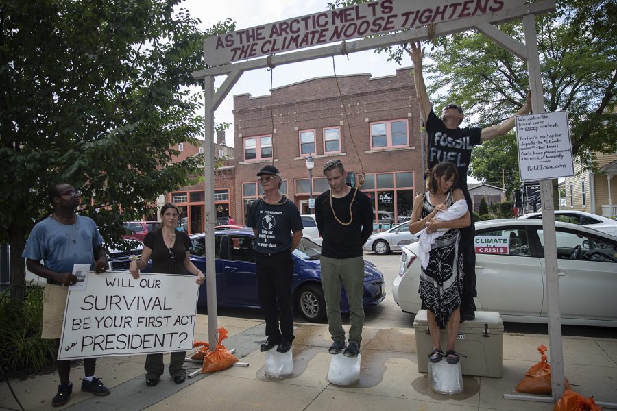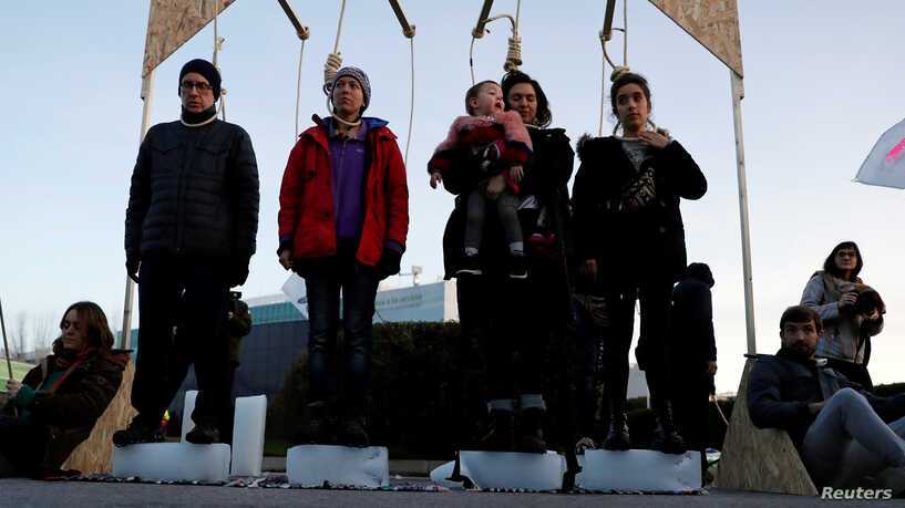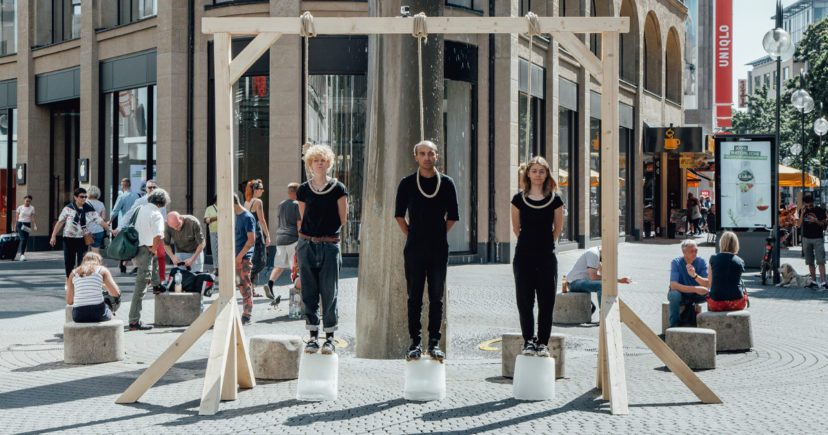 한편, 2019년 7월, 독일 퀠른 지방의 학생들은 기후위기로 인한 지구온난화 문제를 알리기 위해 목에 줄을 걸고 광장에 나섰습니다. 얼음이 녹아 없어지면, 광장의 학생들도 목숨을 잃게 됩니다. 이들은 기후위기와 지구 온난화로 인해 우리가 서서히 죽어가고 있음을 알리기 위해서 용감하게 교수대 아래 섰습니다.