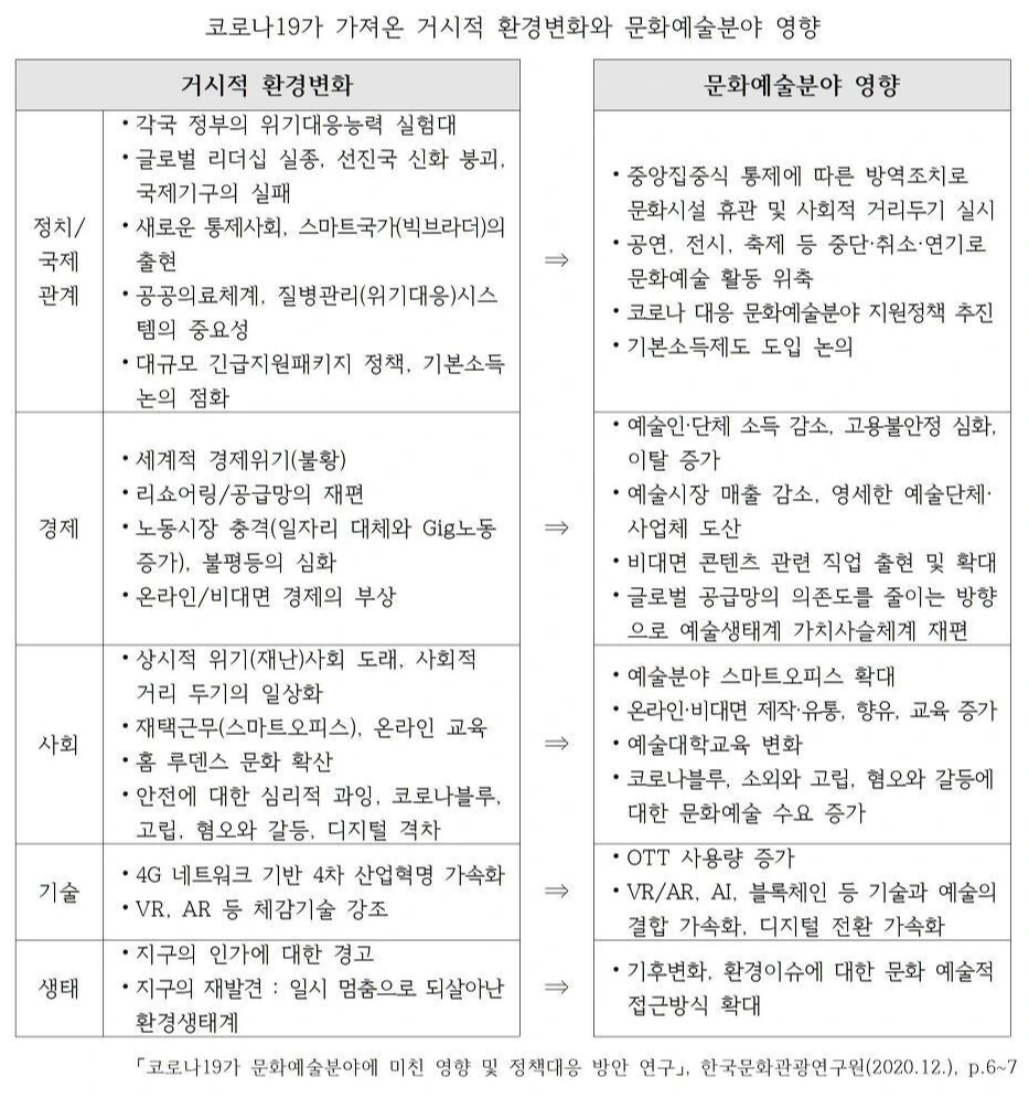 보고서에서는 아래와 같이 코로나19가 가져온 거시적 환경변화와 문화예술분야 영향을 분석하여 기존 문화예술분야의 취약한 구조를 근본적으로 개선해야 한다는 맥락을 드러냈다.