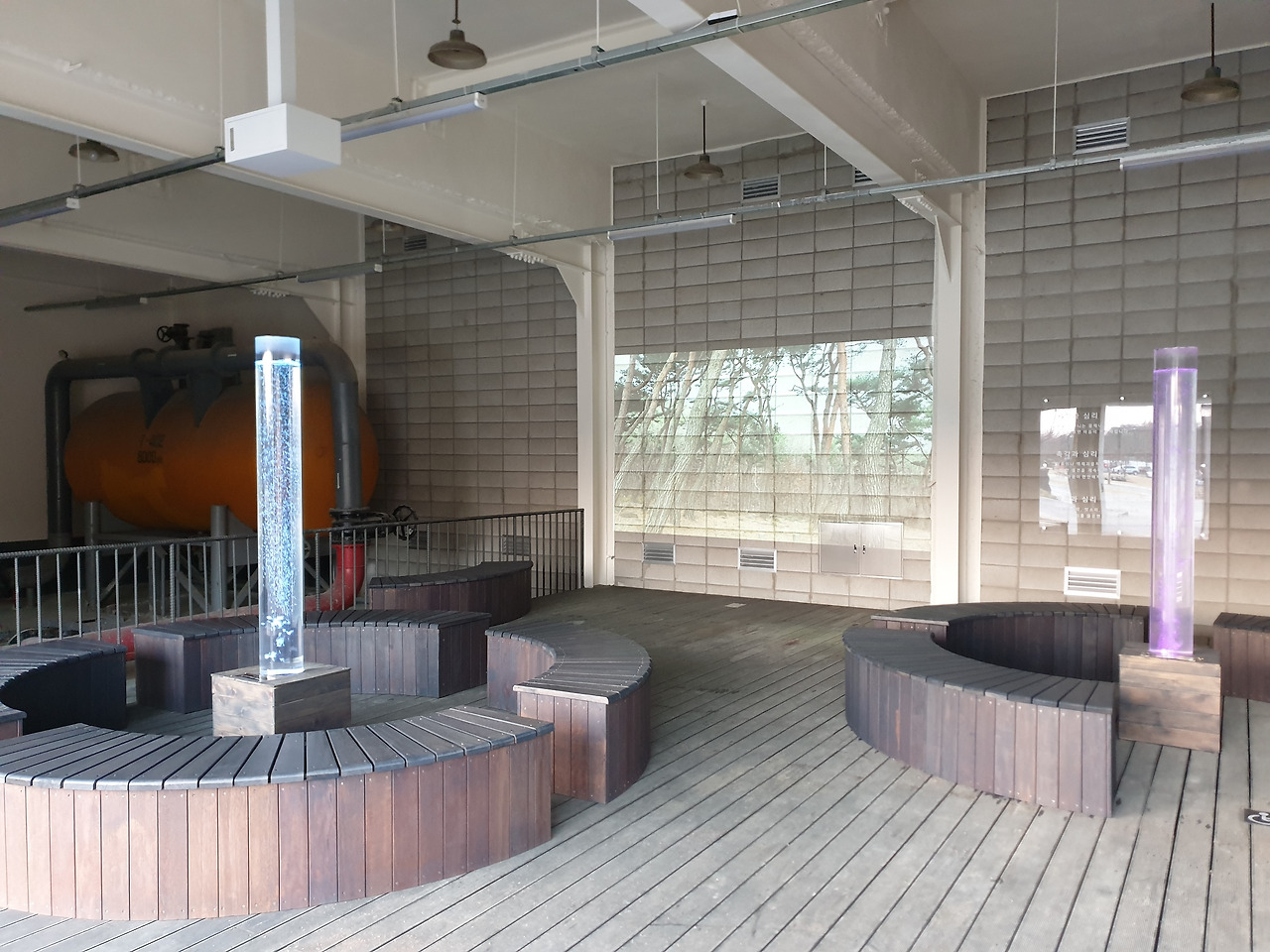 공원이 되기 전 석유비축기지에는 화재 진압을 위해 특수 소화액을 저장하던 공간이 있었다. 설비동의 소화액 저장실인데, 이곳이 서울시 디자인정책과에서 추진하는 ‘빛을 활용한 심리 안정 공공 디자인 개발’ 대상지로 선정되어 오감을 활용해 경험하는 휴게 공간으로 재탄생했다. 장작 타는 소리에 이끌려 공간에 들어서니 조명 물기둥과 이를 둘러싼 벤치가 보였다. 기둥 안에선 물방울이 올라오며 빛을 받아 반짝였고, 벽면에는 모닥불이 타는 빔 영상을 상영 중이었다. 잔잔한 ASMR 콘텐츠에 마음이 한결 편해졌다. 이 공간은 2021년 12월까지 만날 수 있다.
