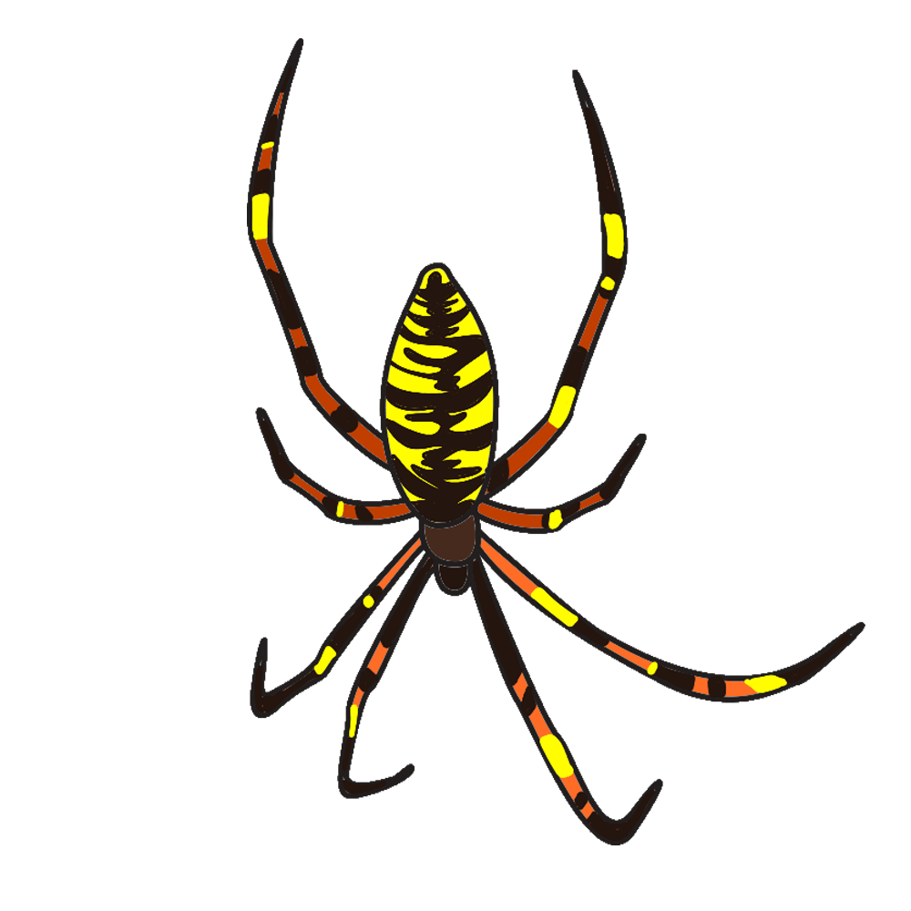 노란색 바탕에 검은 띠무늬가 있고, 배에는 붉은색 줄무늬가 불규칙하게 나 있다. 거미줄 끝에서 느껴지는 진동으로 먹이의 위치를 확인한다. 먹이를 독으로 마비시켜 실로 감아 먹는다.