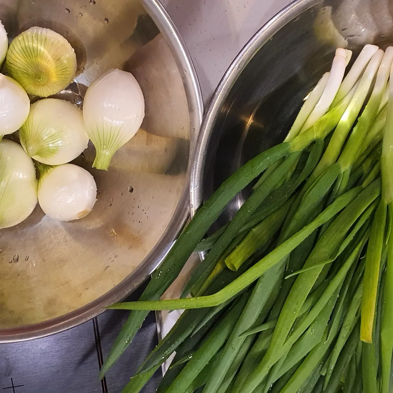 고양 로컬푸드 직매장에서 만난 조선파와 내 손안에 쏙 들어오는 귀여운 햇양파를 보니 이거 이거 또 손이 근질근질해서 조금, 만 샀다. 이 바쁜 와중에 내가 미쳤지 하면서도 밤이 되자 미니 김장 준비를 한다. 깨끗이 씻고 물기를 빼는 동안 부재료 준비.