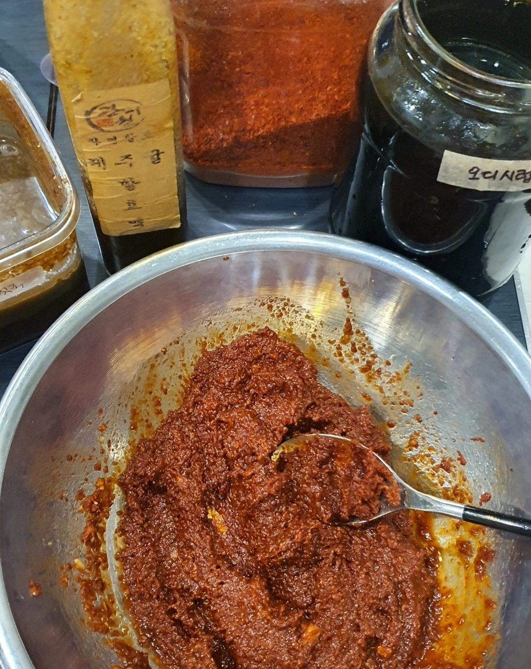 전라도 나주에서 이모가 직접 빻아준 고춧가루랑 괴산농협 태양초 고운 고춧가루를 반반 섞고 매실청 대신 오디 시럽과 제주 귤 발효액을 조금씩, 황옥 수수가루 넣은 풀도 적당히 넣어 농도를 잡는다.