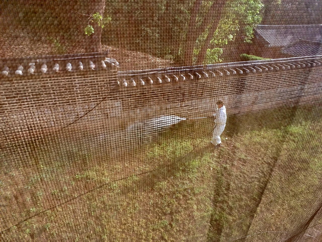 종묘 이곳저곳에 살충제가 뿌려진다.